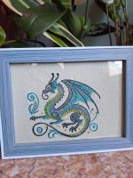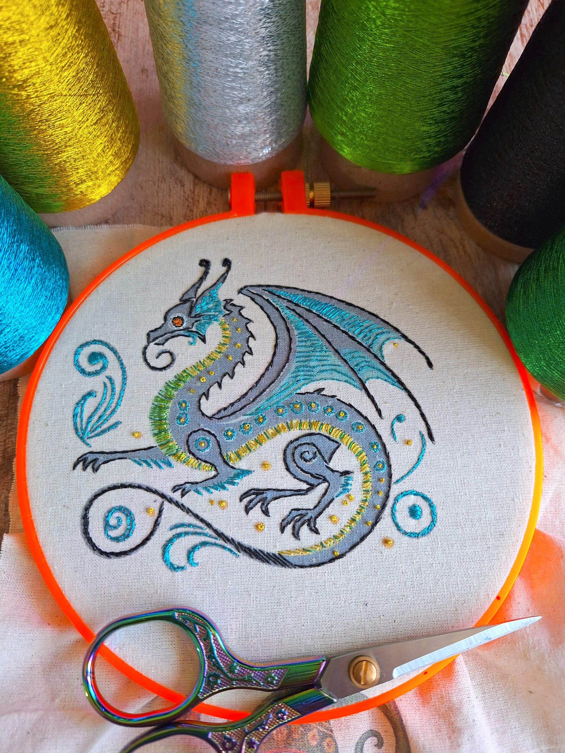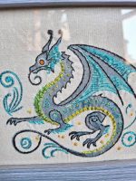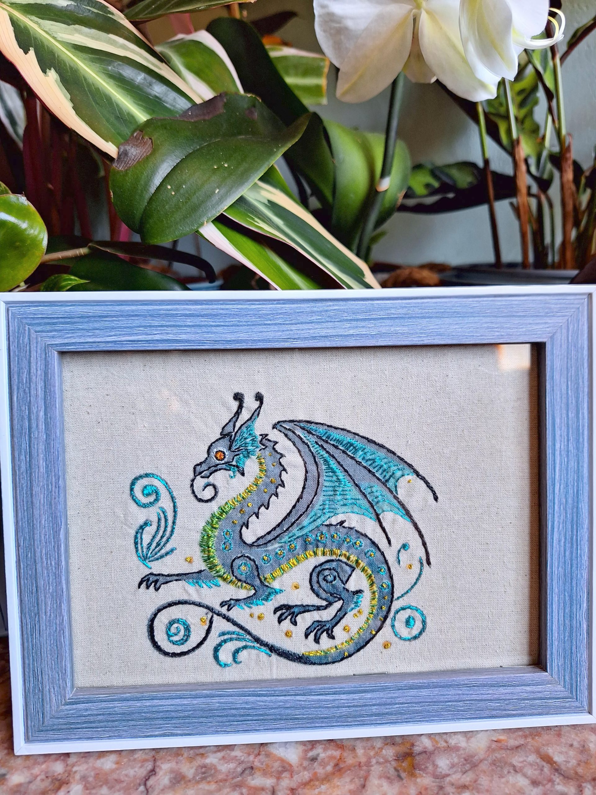 - Descripción: Cuadro bordado a mano en técnicas mixtas, inspirado en la figura del dragón como símbolo de fuerza, sabiduría y protección. Cada puntada da forma a una criatura ancestral que representa el poder interior y la energía vital. Obra única e irrepetible, creada de manera completamente artesanal.