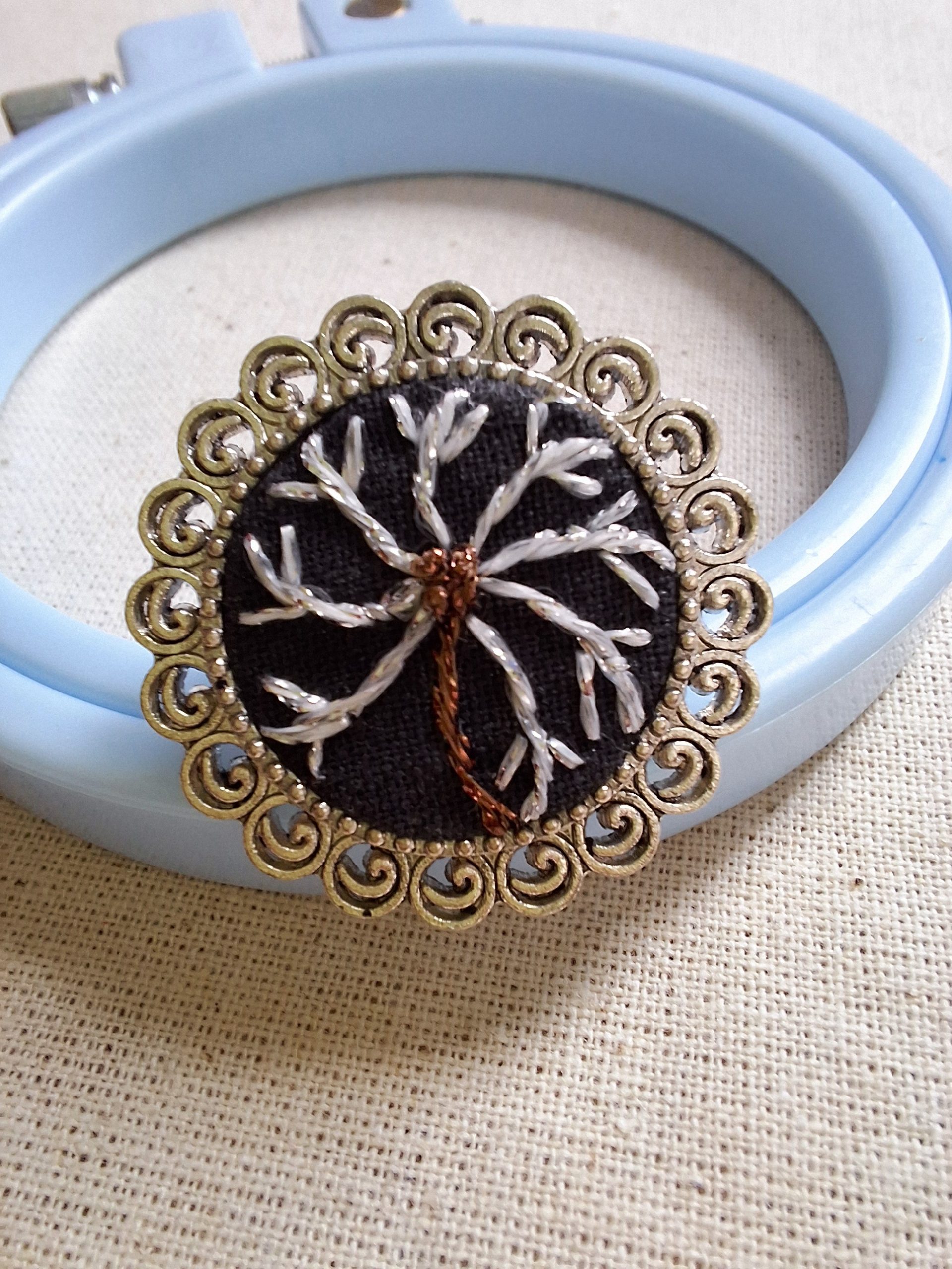 - Descripción: Anillo bordado a mano con hilos metalizados. Un micro universo donde un Diente de León florece en un fondo negro. Sopla y pide un deseo.