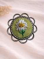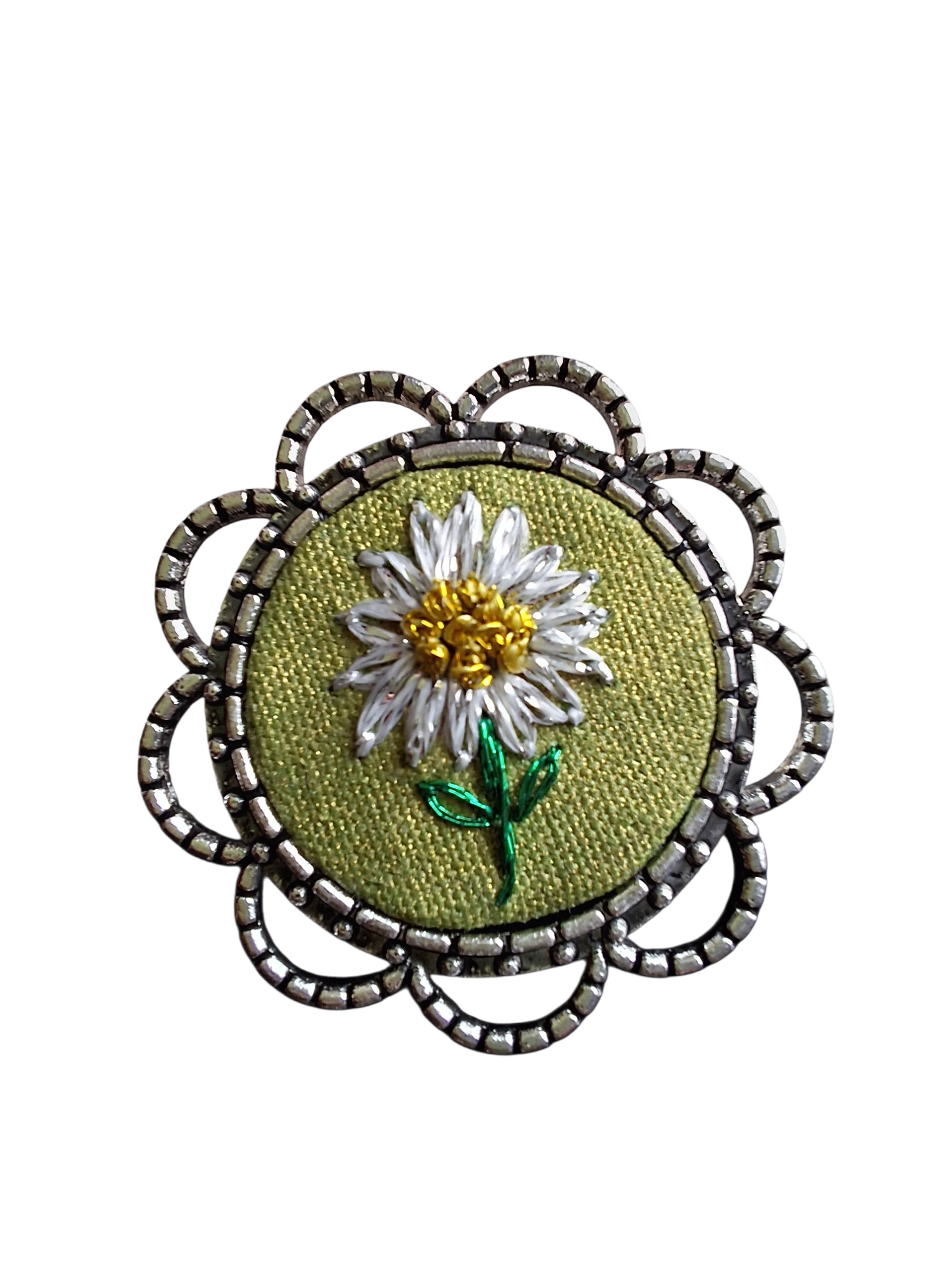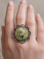 • Descripción: Anillo bordado a mano, inspirado en la belleza simple de la naturaleza. Su diseño representa una delicada margarita, cuidadosamente bordada sobre un fondo verde que resalta sus detalles y la hace aún más especial.
