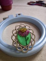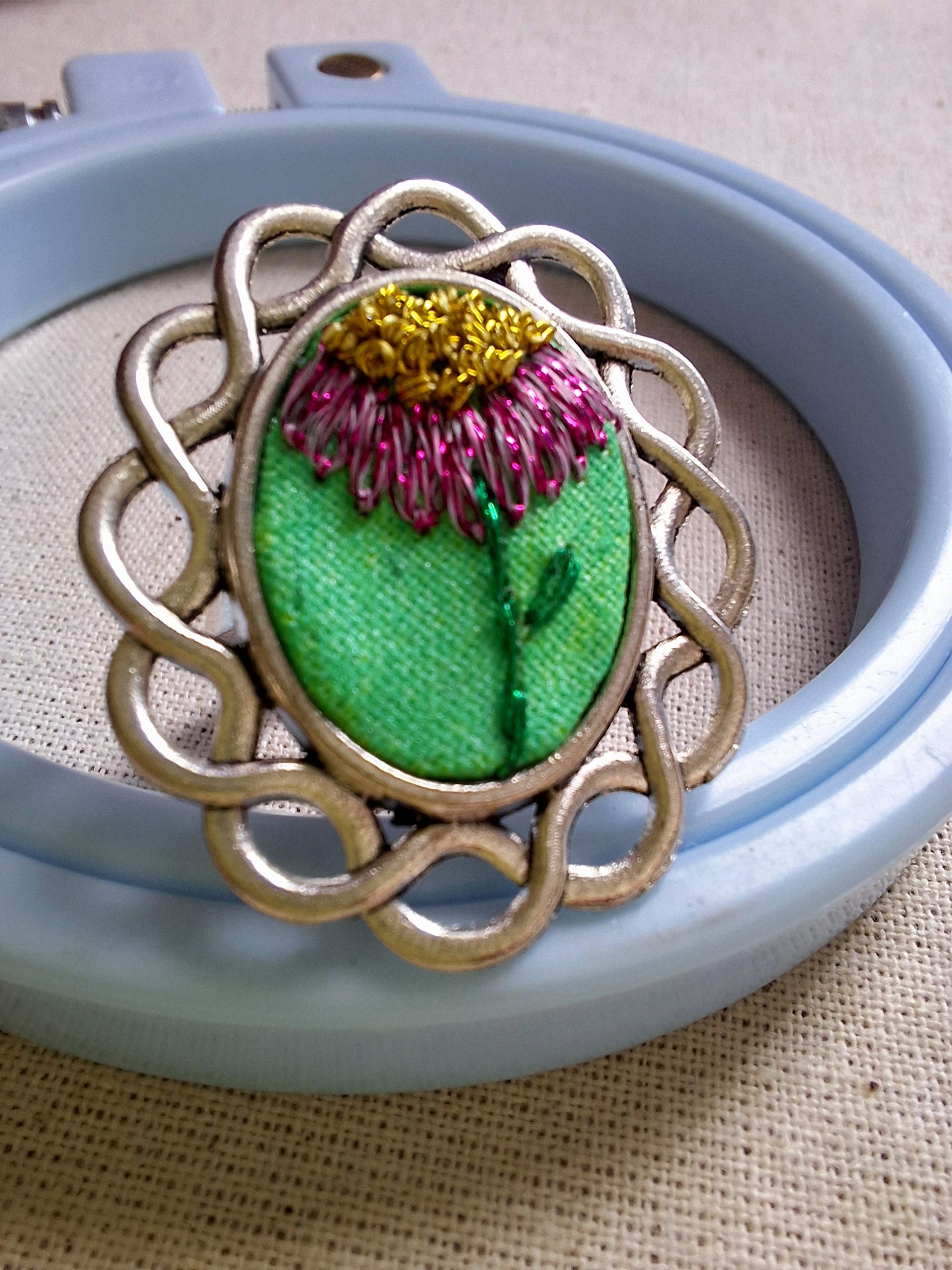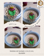 - Descripción: Anillo bordado a mano con una delicada flor rosada sobre un fondo verde, inspirado en la armonía de la naturaleza. Cada pieza es única, creada puntada a puntada y transformada en una joya llena de color y vida. Bordado a mano con hilos metalizados.