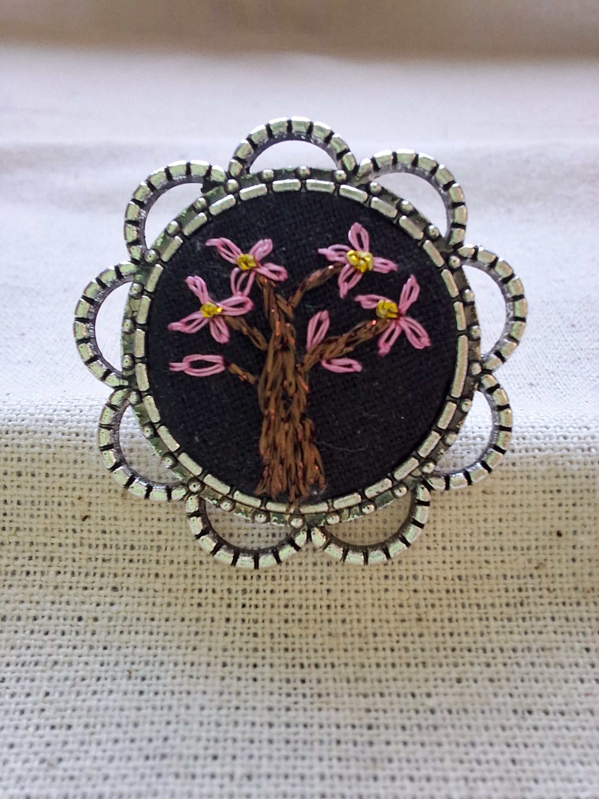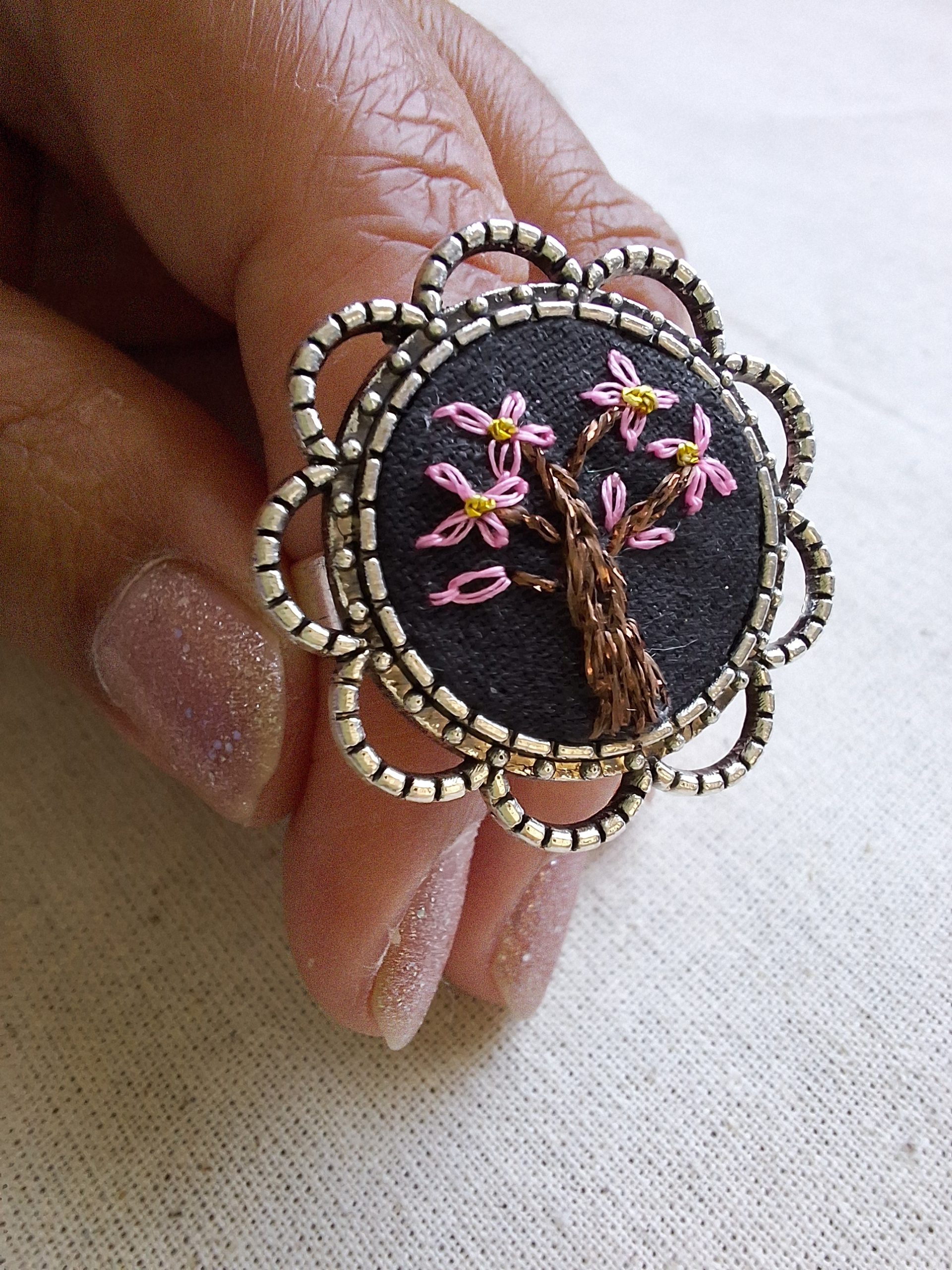 - Descripción: Sakura es un anillo bordado que representa el árbol de cerezo en flor, símbolo de renovación, belleza y lo efímero de la vida. Cada pieza es única, realizada puntada a puntada con dedicación, convirtiendo el bordado en una joya única. Bordado a mano con hilos metalizados.