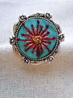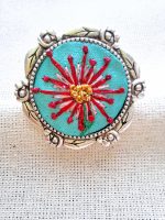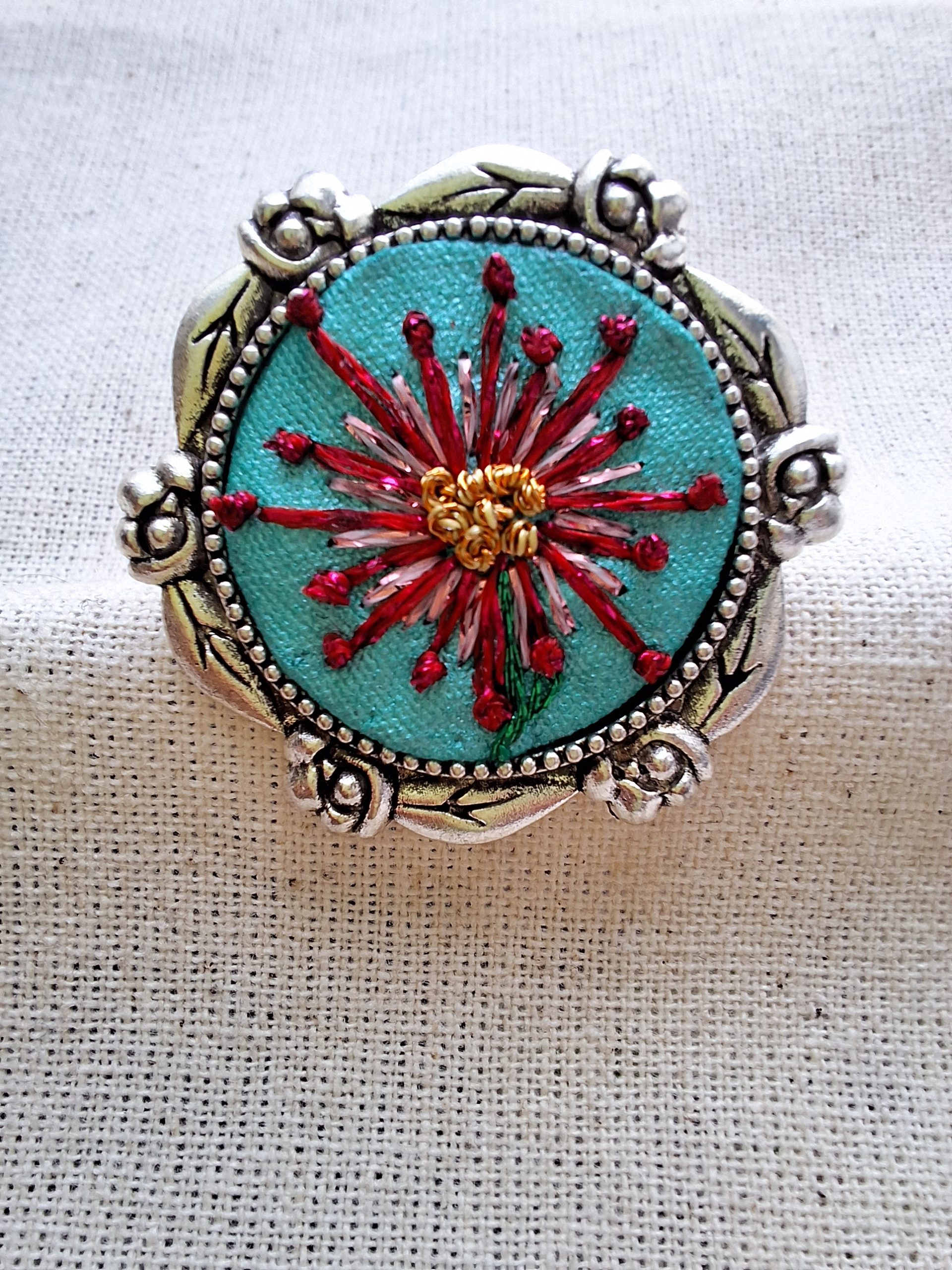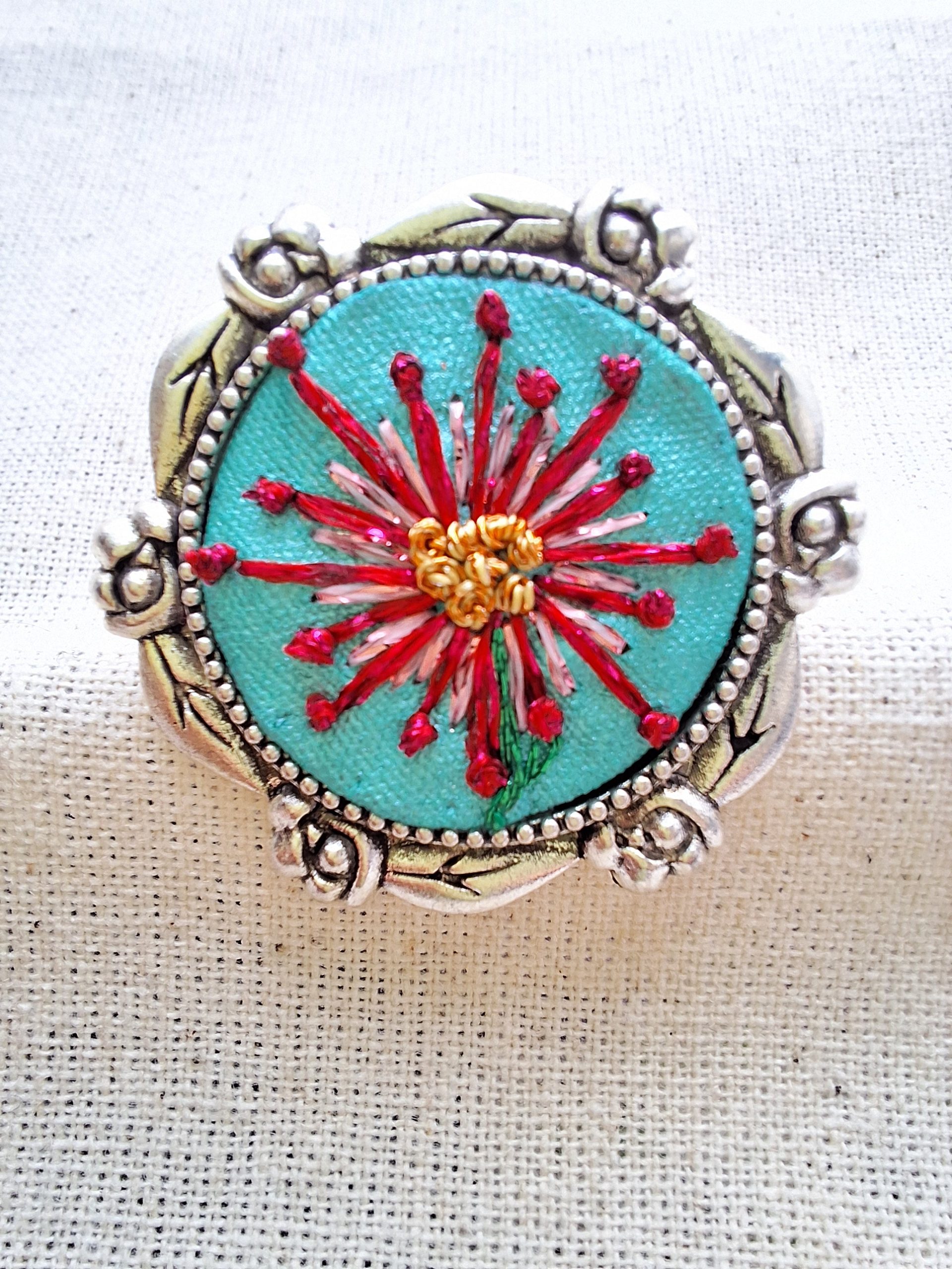 - Descripción: Anillo bordado a mano con hilos metalizados, inspirado en una flor luminosa que evoca la forma de un pequeño sol. Bordado en tonos rojos y rosados, este diseño transmite calidez, energía y delicadeza. Cada pieza es única, con sutiles variaciones propias del trabajo artesanal, convirtiéndolo en una joya especial y llena de intención.