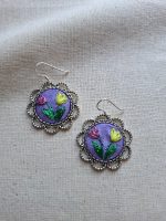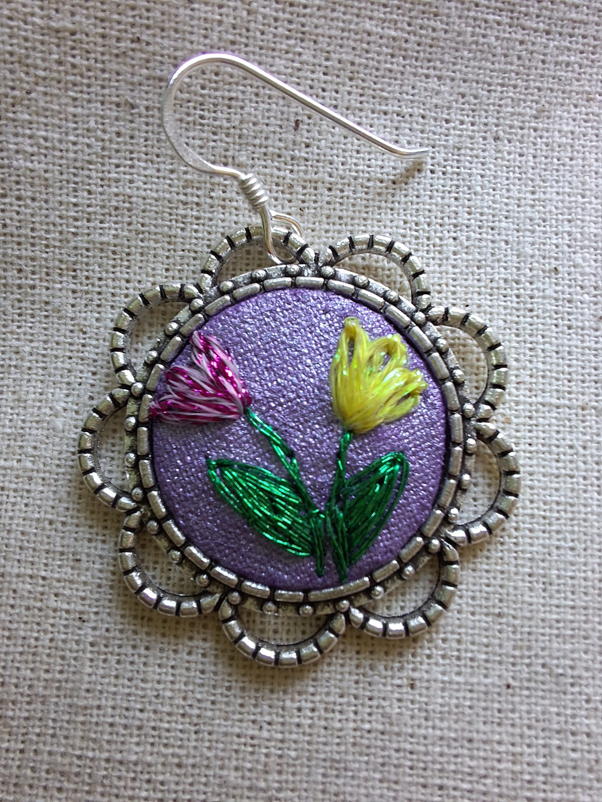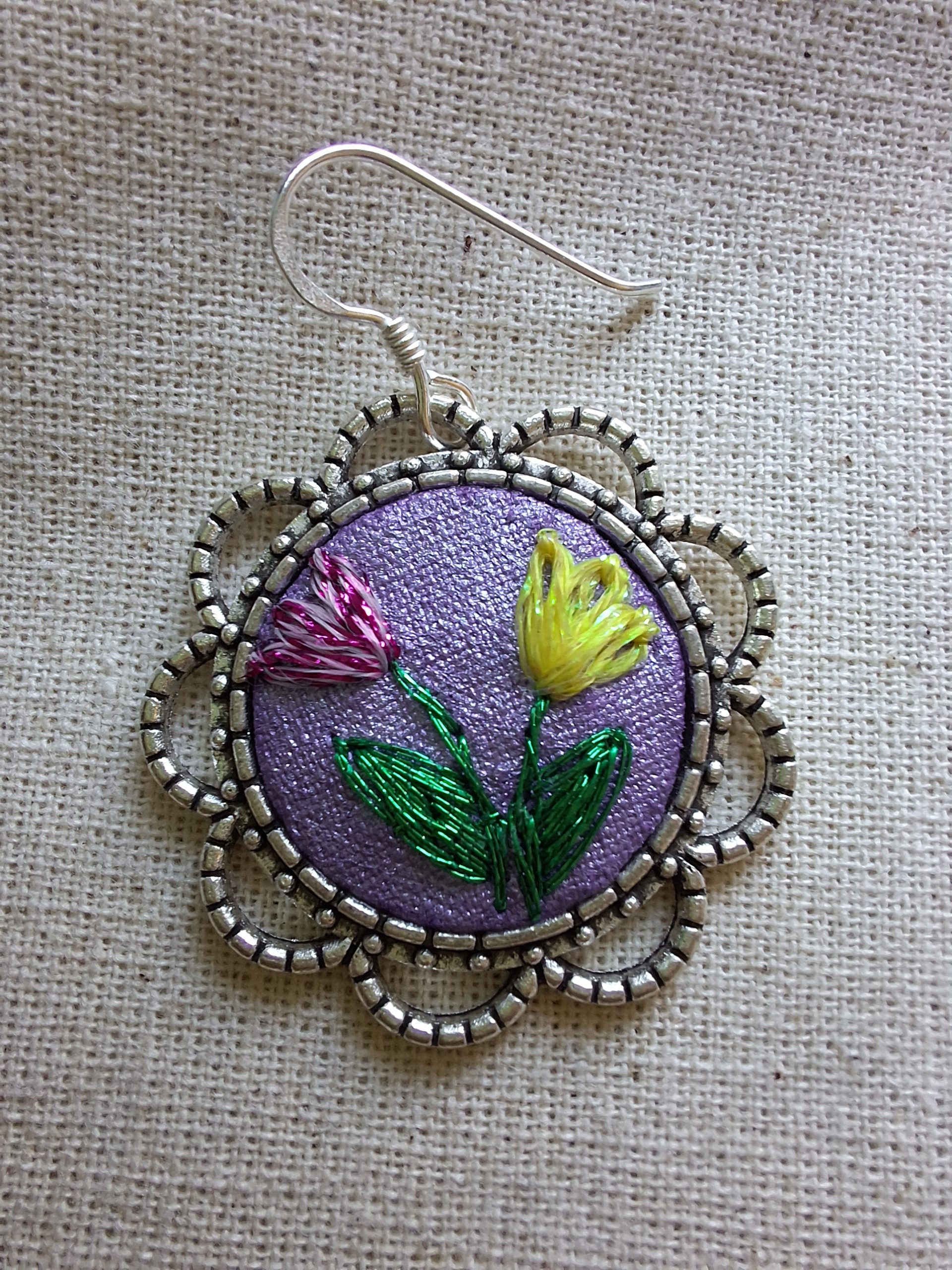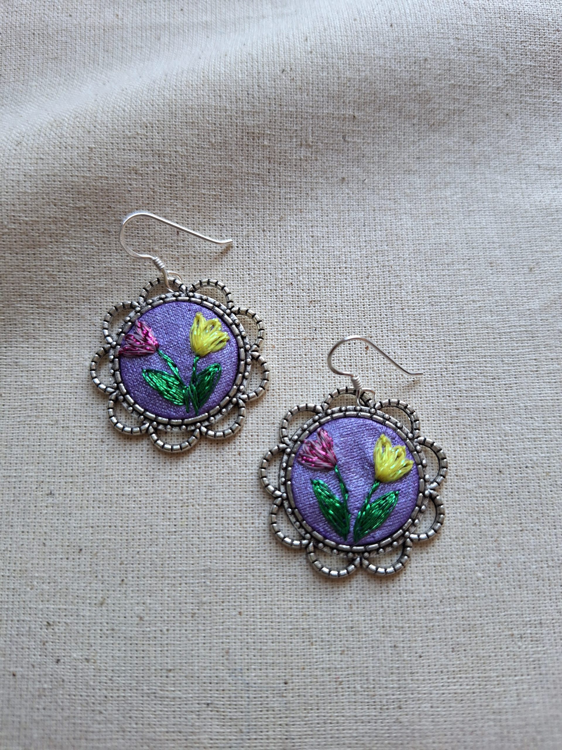 - Descripción: Aros bordados a mano con dos tulipanes, uno amarillo y uno rosado que simbolizan alegría, dulzura y equilibrio. Cada par es único, realizado puntada a puntada y transformado en una joya floral llena de color y delicadeza. Bordados con hilos metalizados.