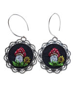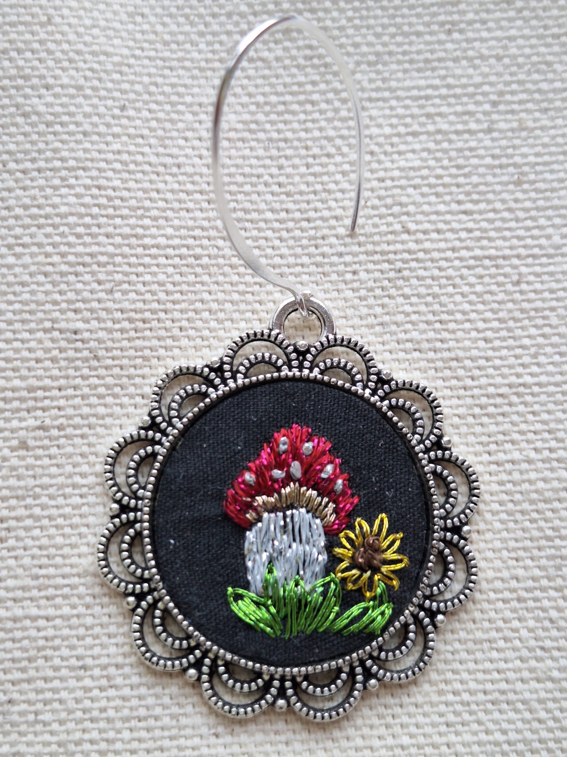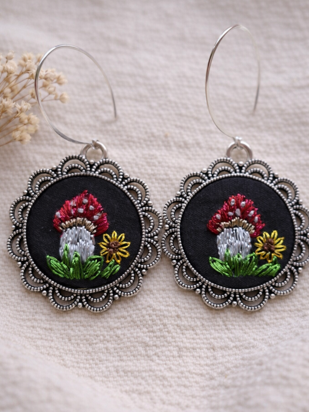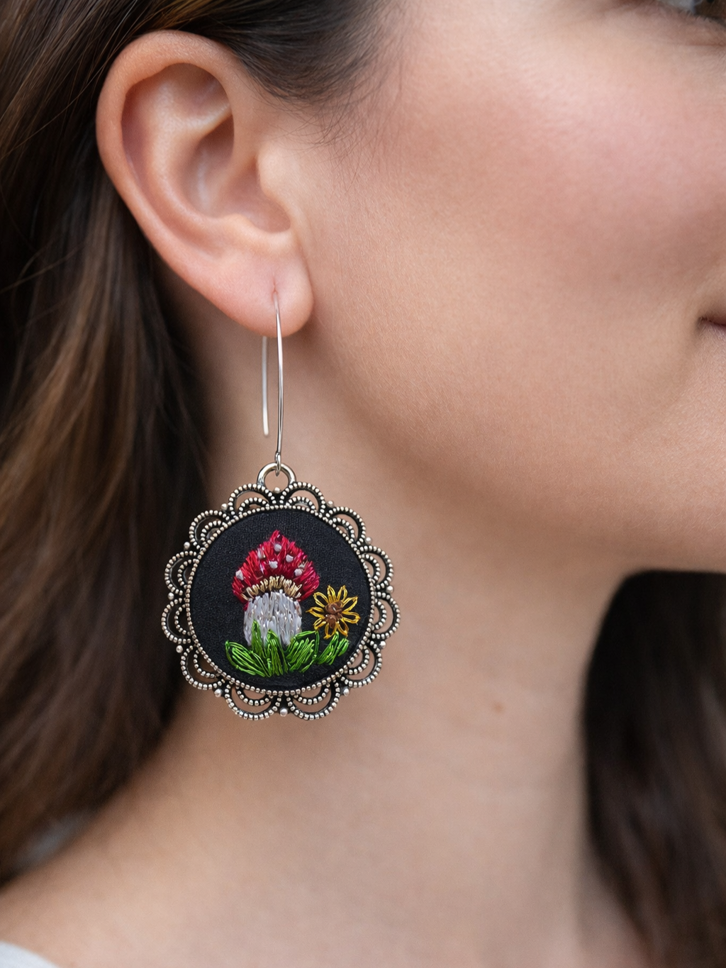- Descripción: Delicados aros con microbordado realizado completamente a mano sobre un fondo negro. El diseño combina una Amanita muscaria y un girasol, creando una pequeña escena inspirada en la naturaleza y la magia del bosque.