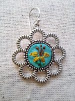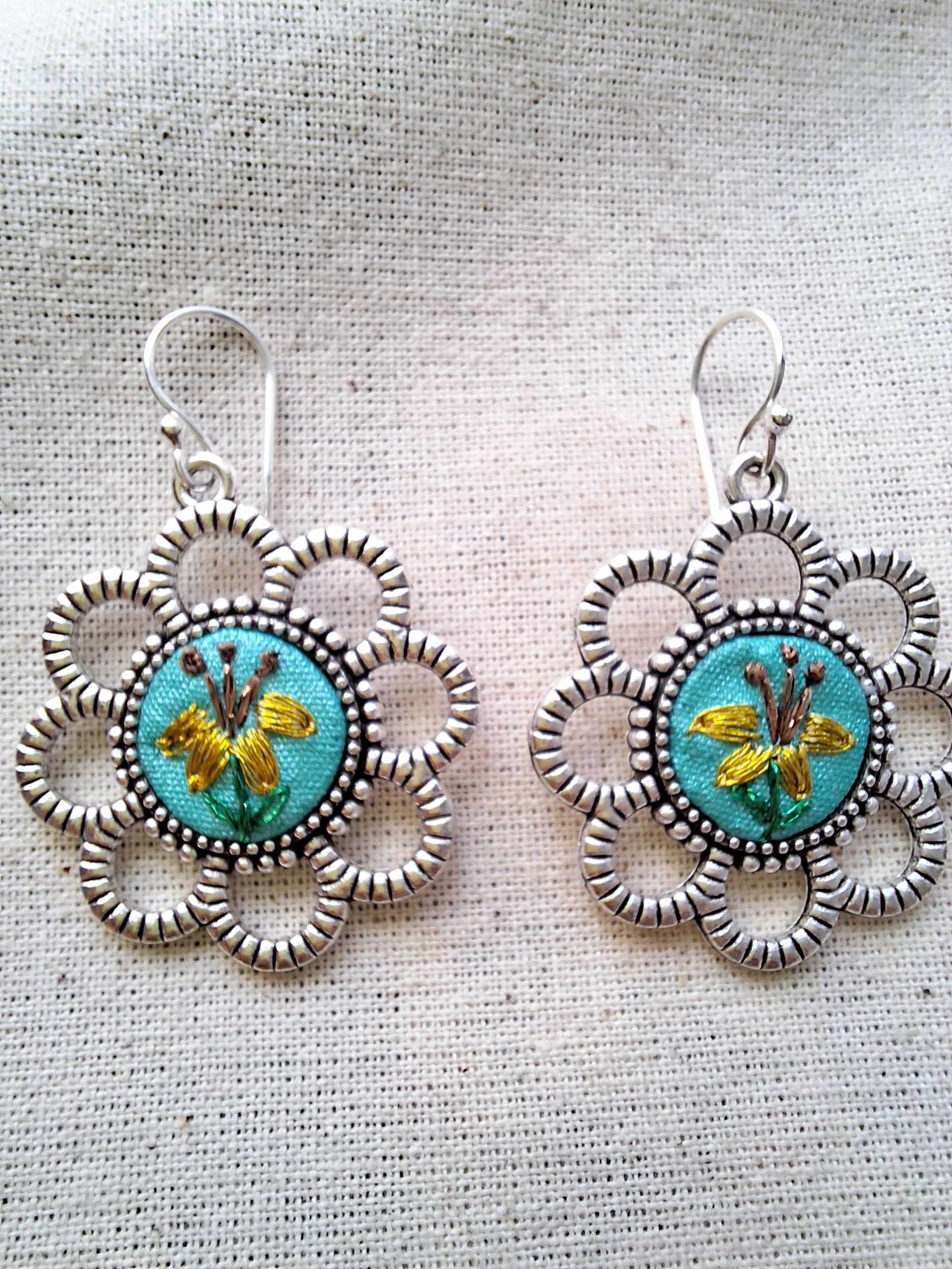 • Descripción:  Aros bordados a mano, con un delicado lilium amarillo sobre un fondo verde metalizado. Su  tamaño pequeño los hace sutiles, livianos y perfectos para el uso diario. Cada par es único, con pequeñas variaciones que reflejan la belleza del bordado artesanal y el cuidado en cada detalle. Bordados con hilos  metalizados.