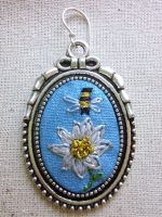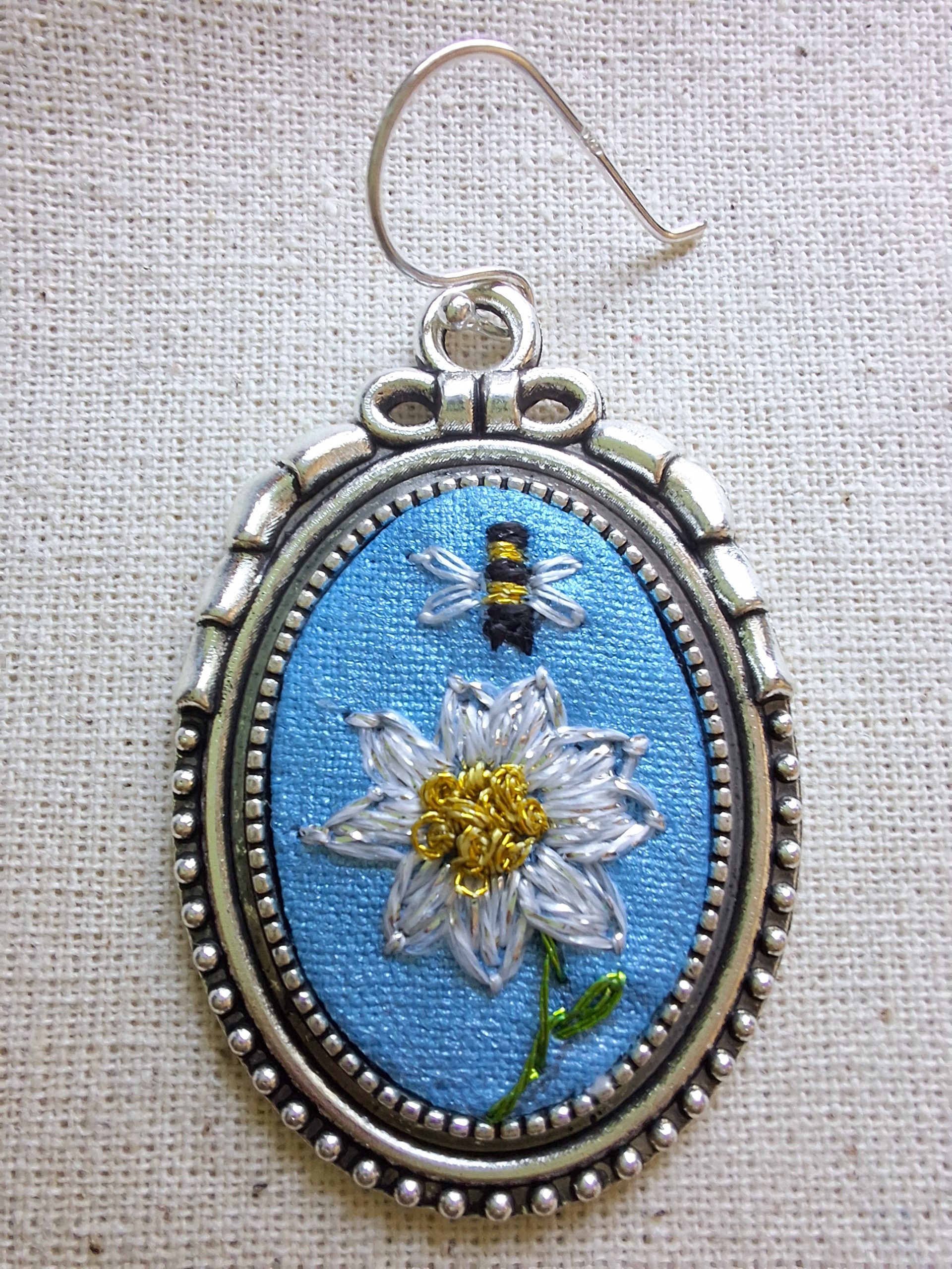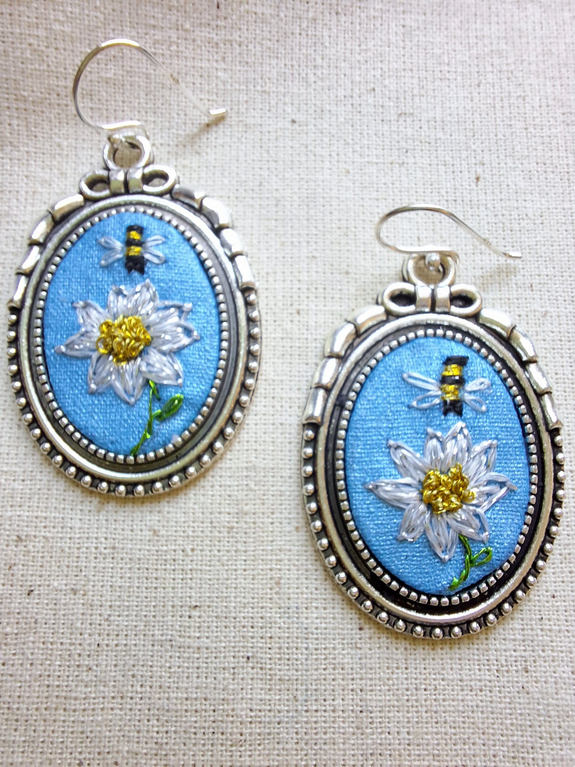 - Descripción: Aros bordados a mano que representan una hermosa flor blanca y una abeja a punto de posarse en ella, símbolo de pureza, vida y equilibrio natural. Cada par es único, creado puntada a puntada y transformado en una joya delicada y llena de significado. Bordados con hilos metalizados.