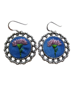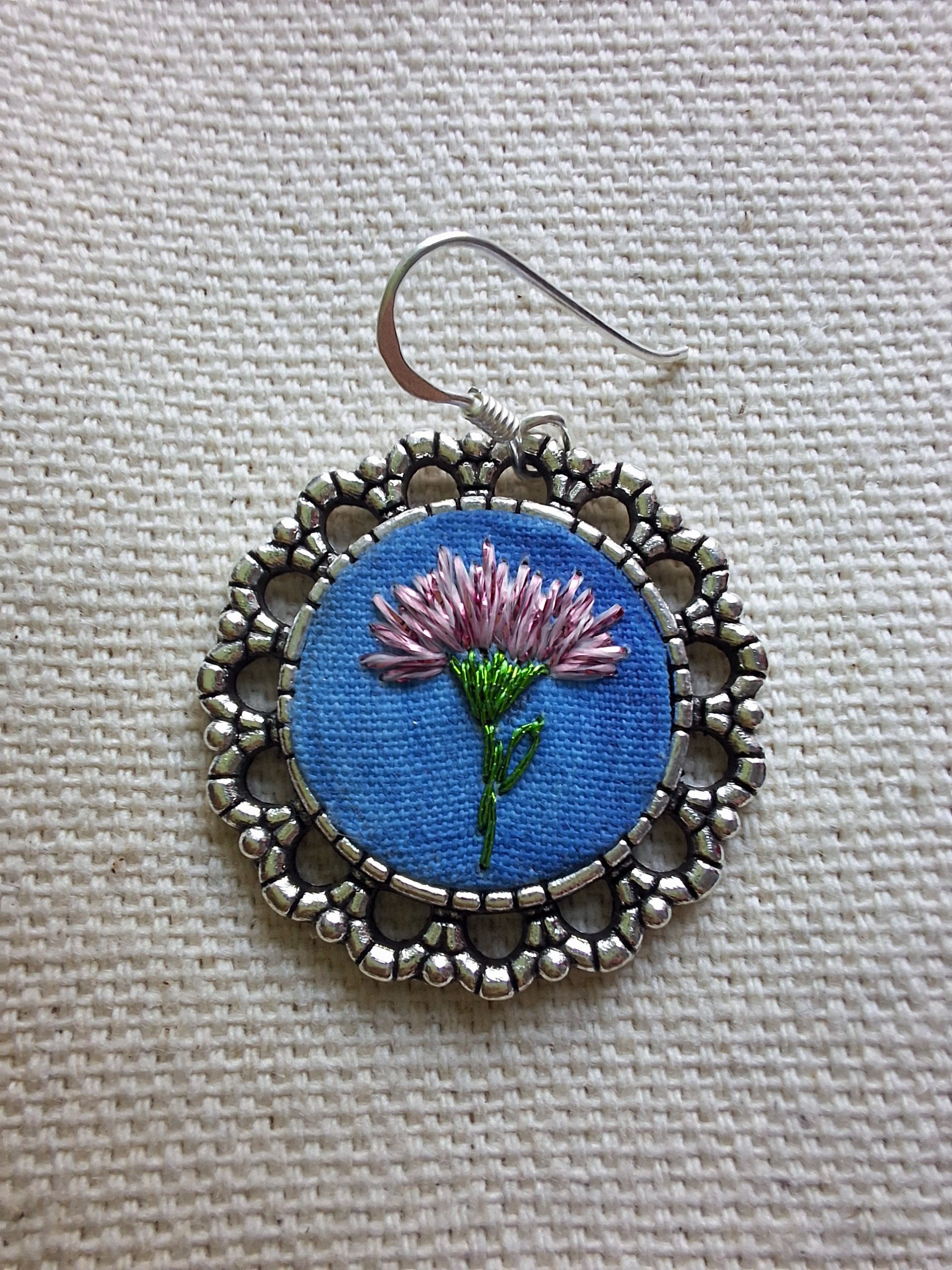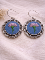 Descripción: Delicados aros con microbordado realizado completamente a mano. El diseño presenta un clavel rosado, inspirado en la belleza y delicadeza de las flores del jardín.