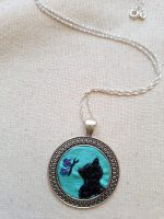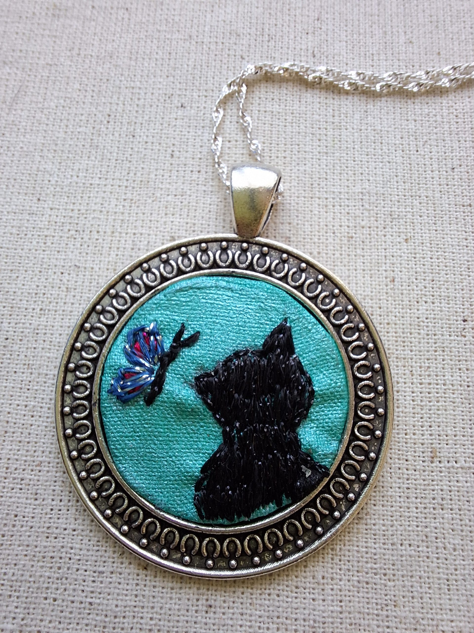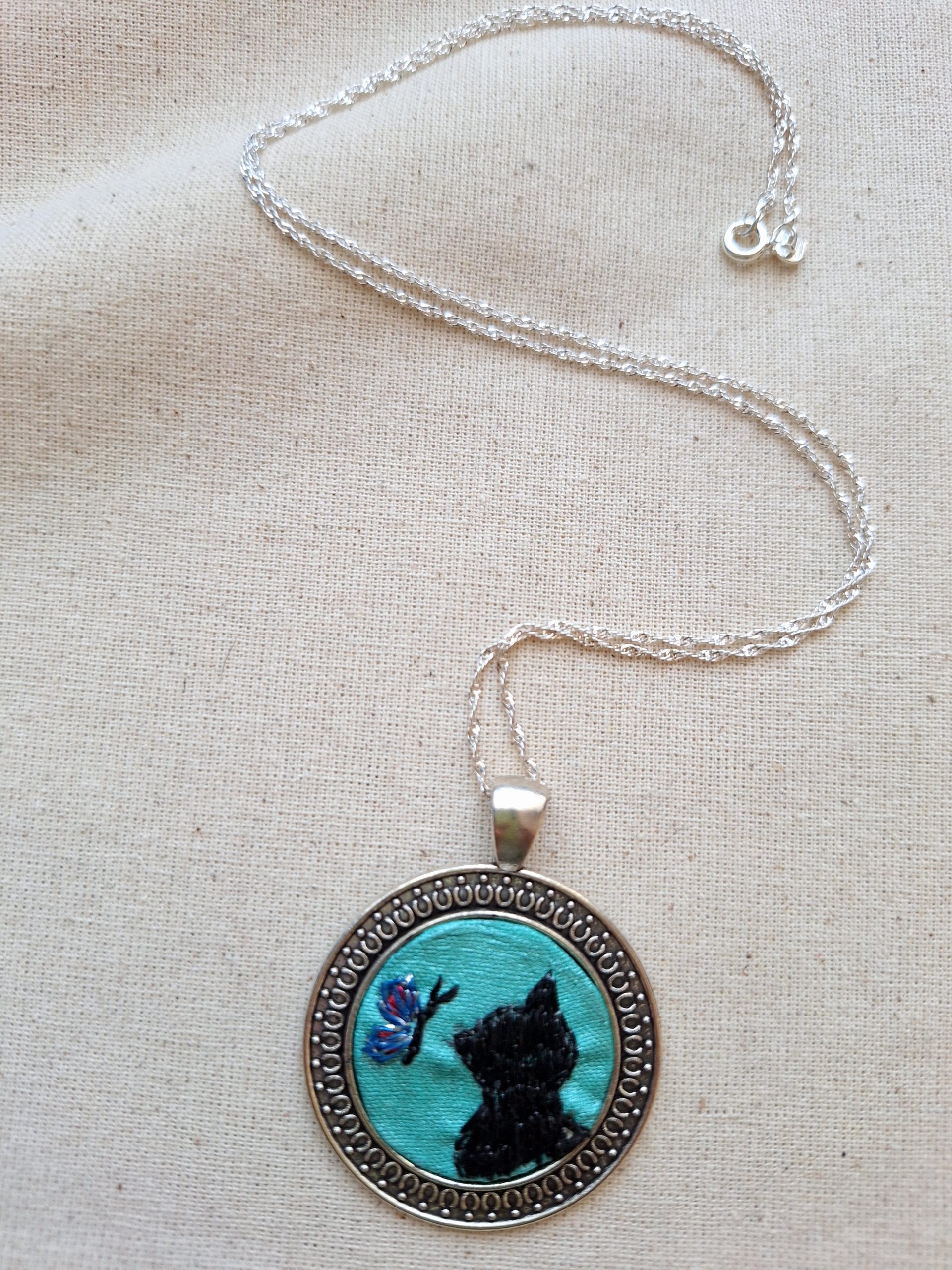 - Descripción: Colgante bordado a mano que representa a un lindo gato negro observando una mariposa, una escena que evoca curiosidad, calma y magia cotidiana. Una pieza artesanal y única, ideal para llevar contigo un pequeño momento de encanto. Bordado con hilos metalizados.