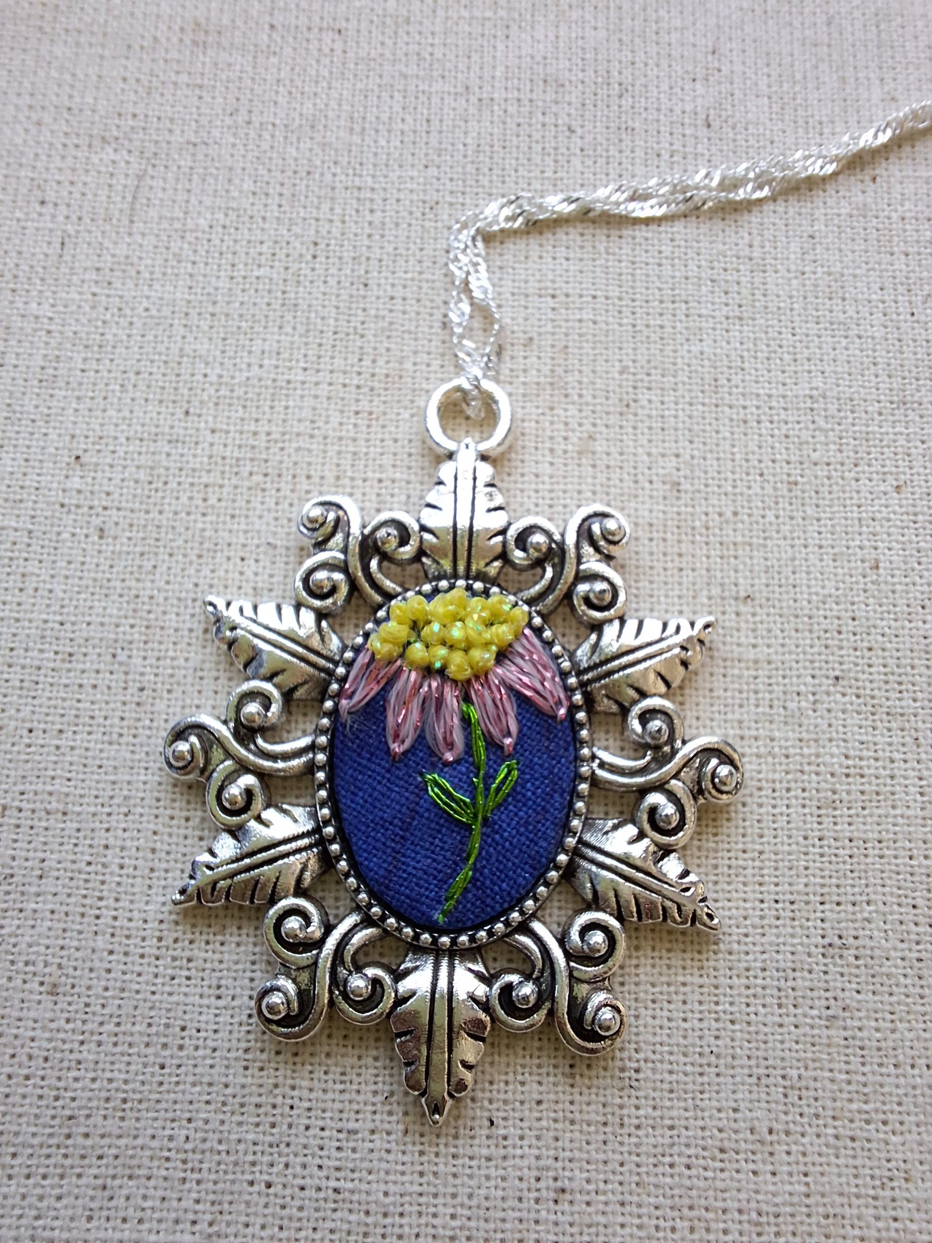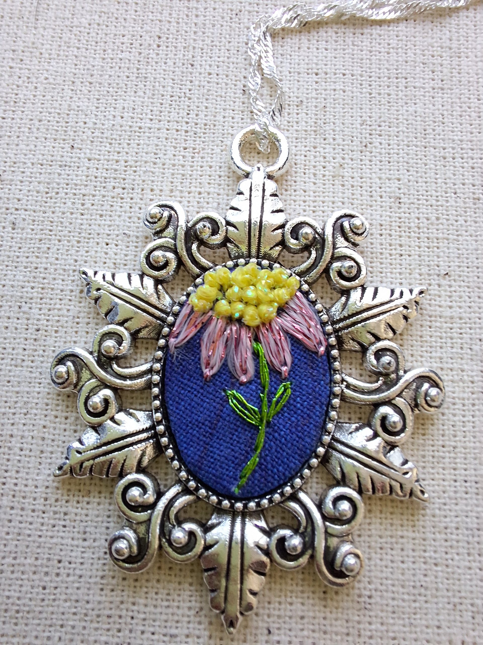 - Descripción: Colgante bordado a mano con una flor rosada cuyo polen sobresale mediante la técnica de nudo francés, aportando relieve y textura. Una pieza delicada y única, realizada puntada a puntada. Bordado con hilos metalizados.