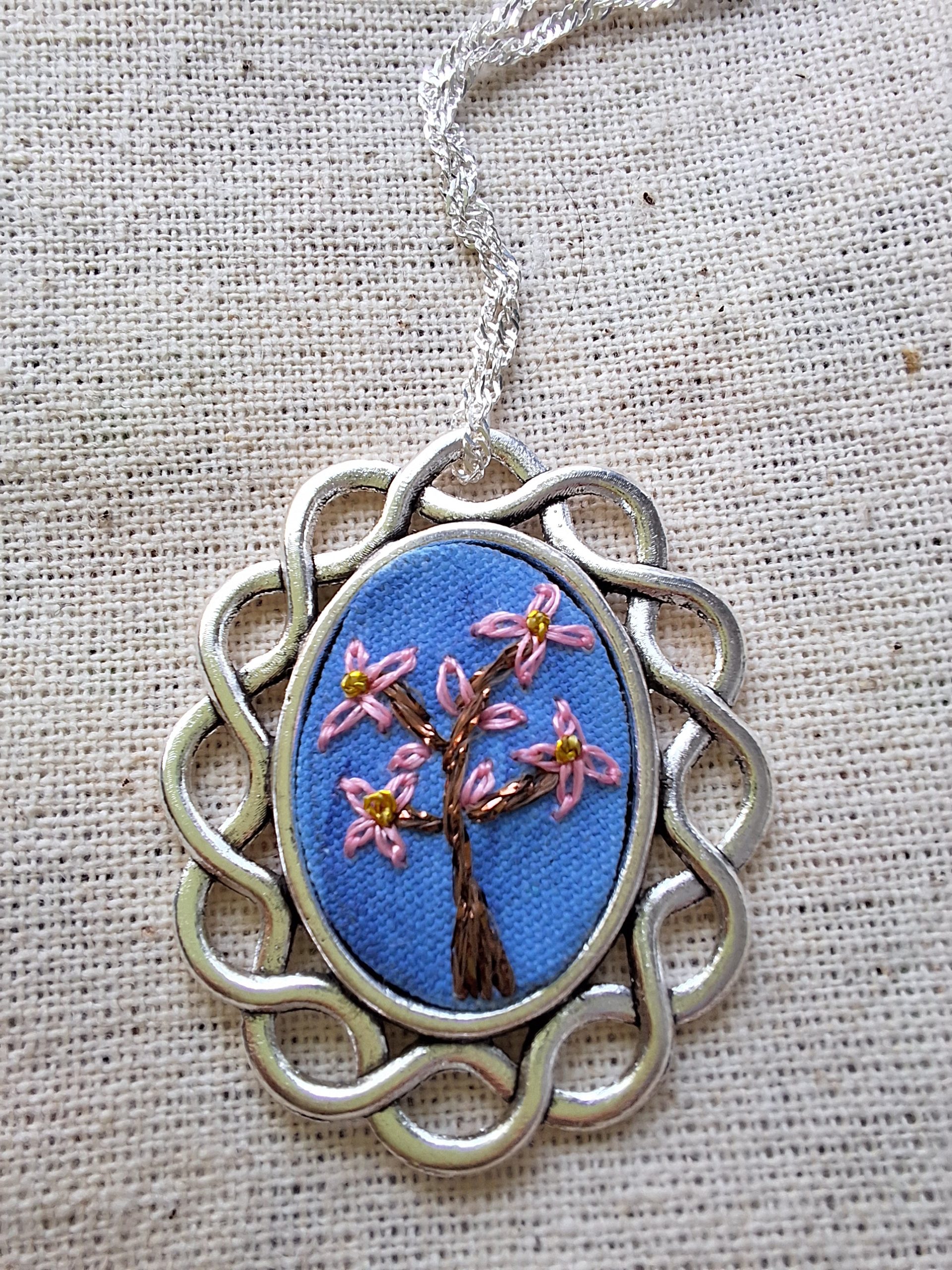 - Descripción: Colgante con un árbol de cerezo bordado a mano, donde cada flor ha sido trabajada cuidadosamente para transmitir la delicadeza y ligereza de la primavera en flor.