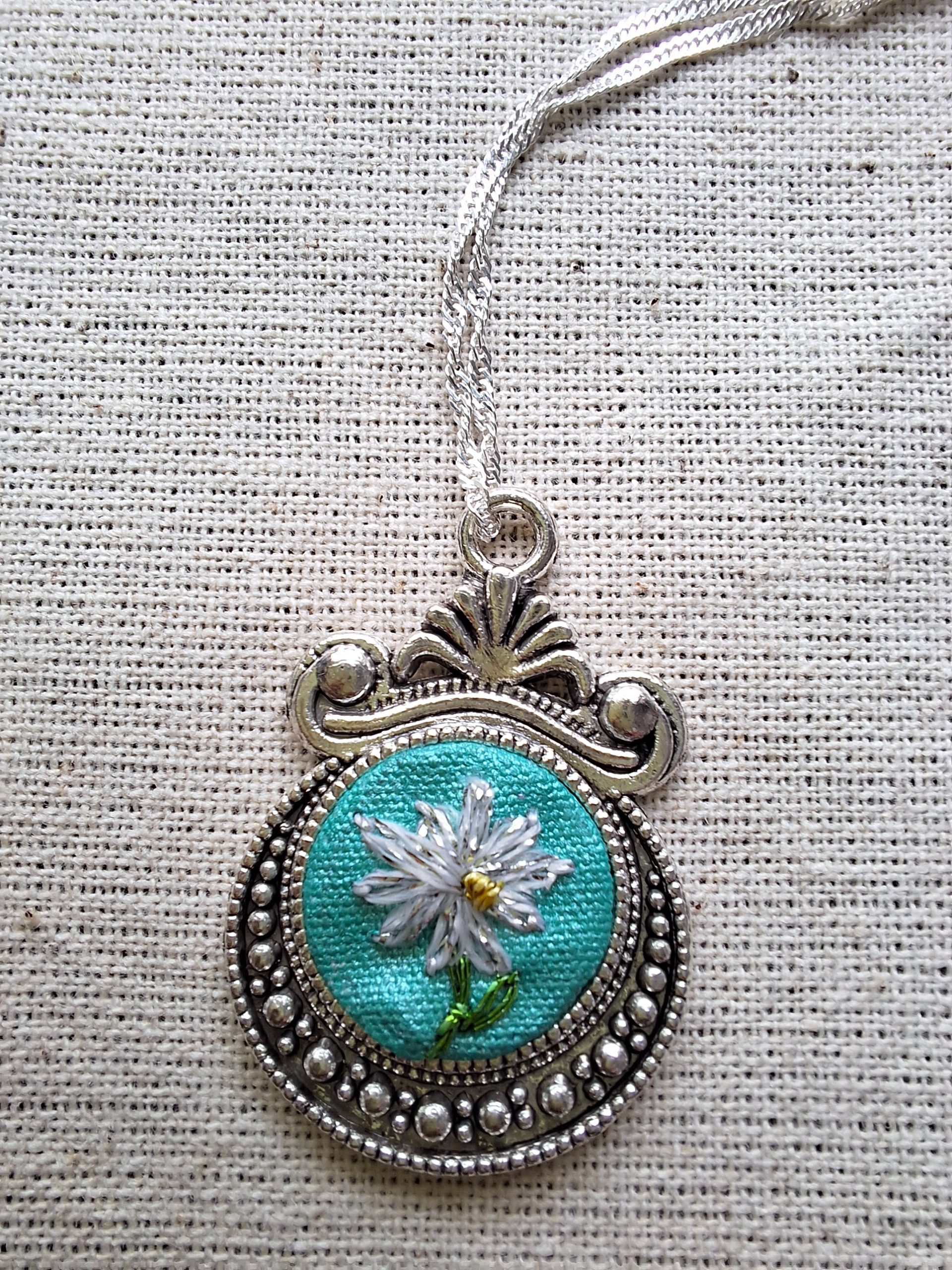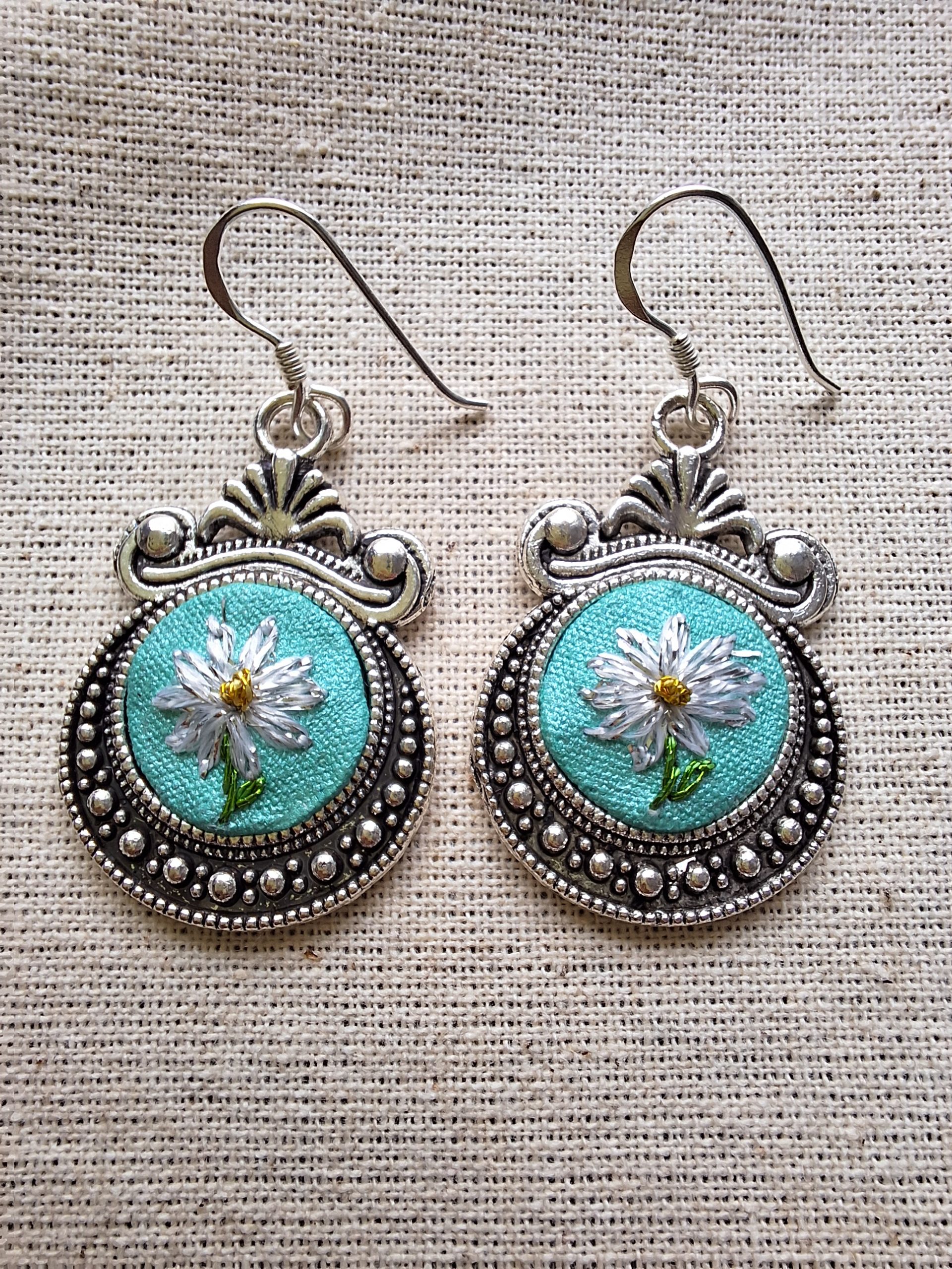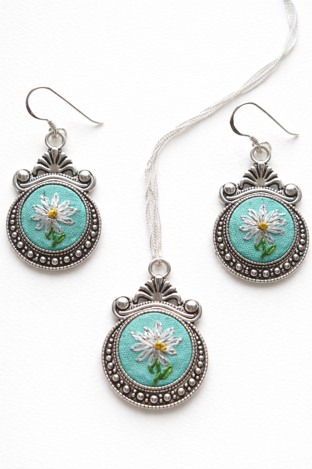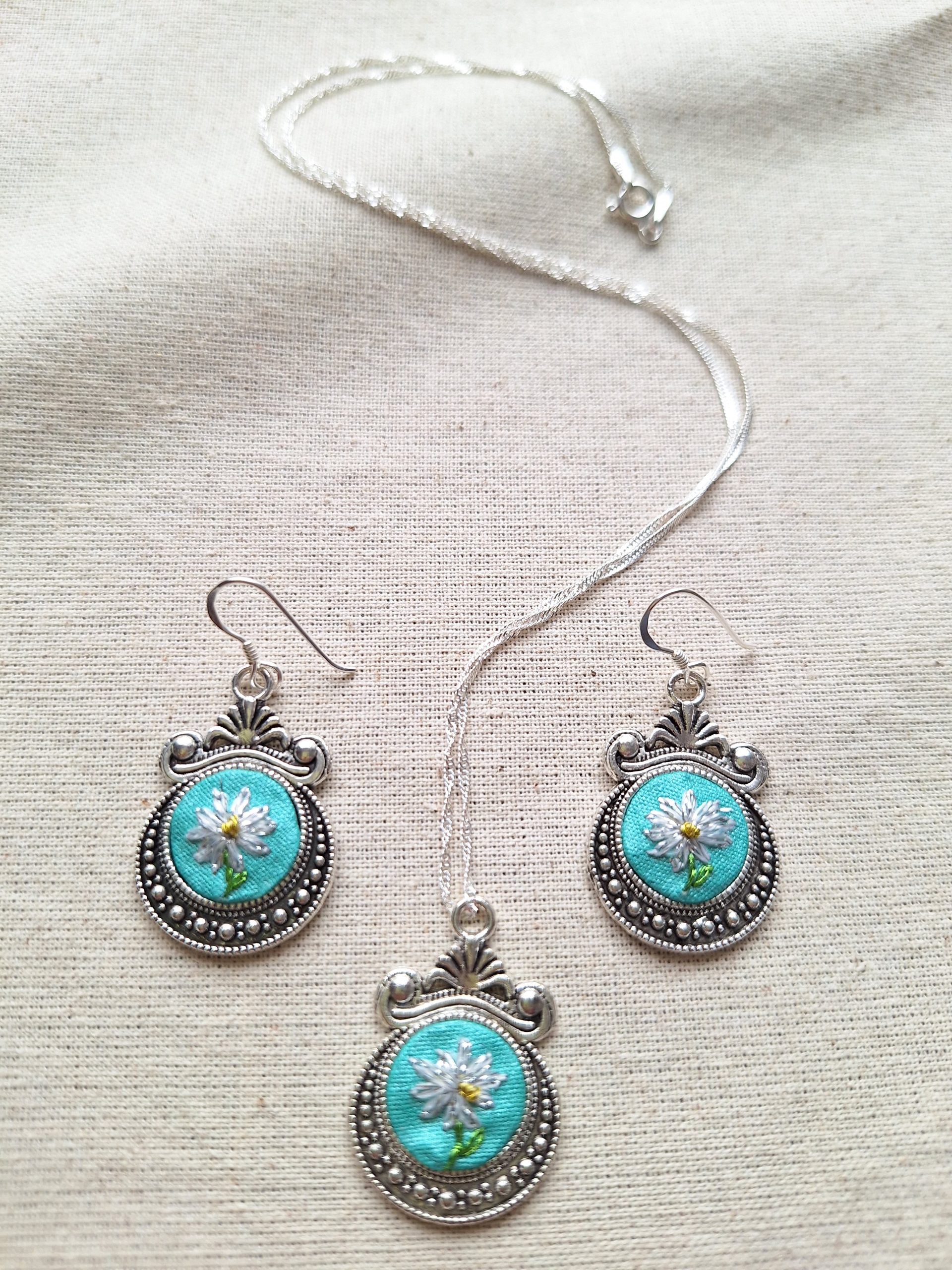 • Descripción: Conjunto compuesto por aros y colgante con un delicado minibordado de margarita, realizado completamente a mano.