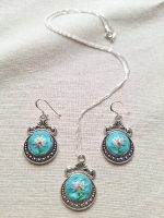 • Características:  Conjunto compuesto por el colgante y aros con un delicado bordado. Bordado a mano con hilos metalizados. Incluye cadena de plata de 45 cms,  aros con ganchos de plata, instrucciones de cuidado . Todo en una hermosa caja.