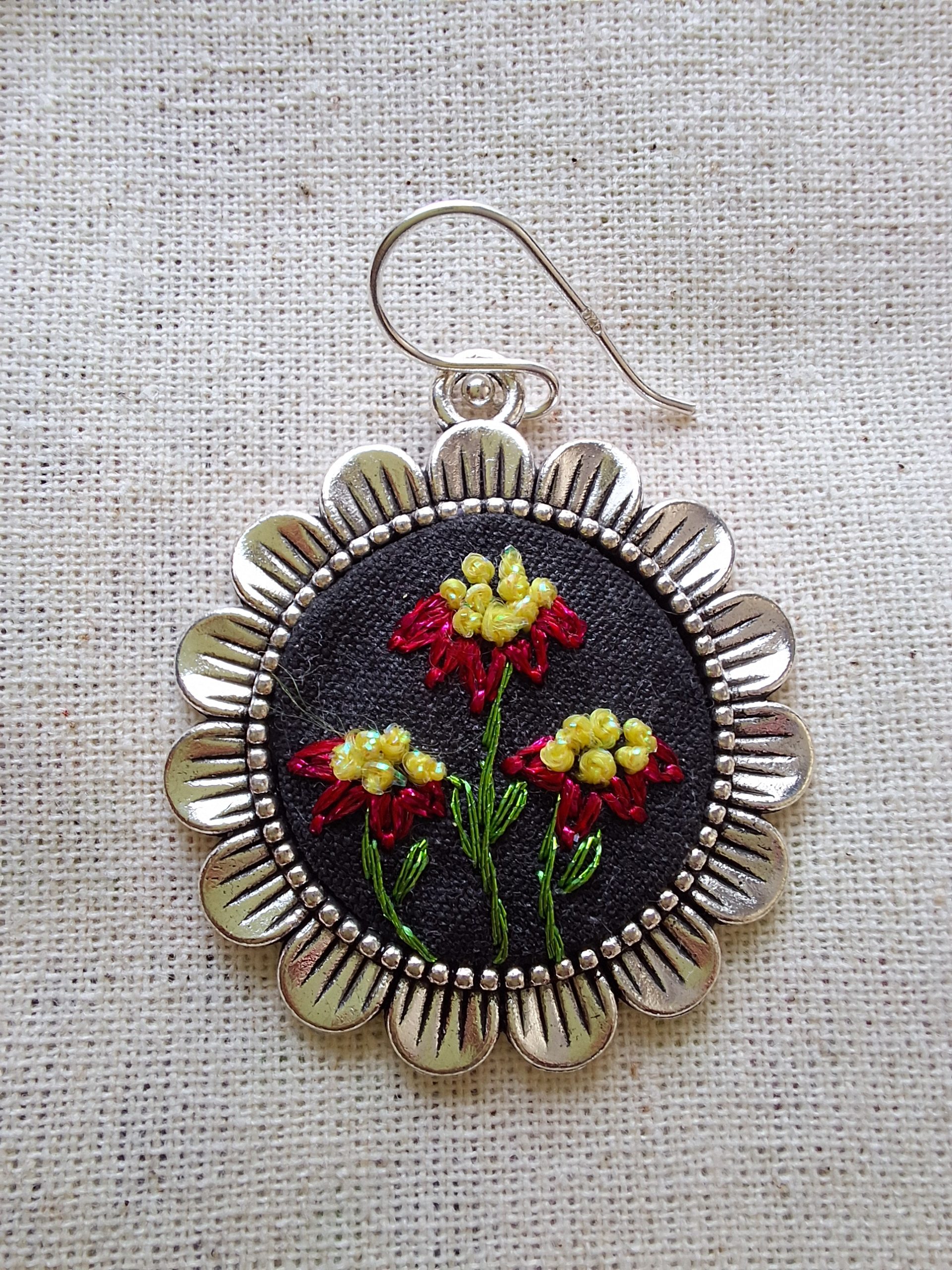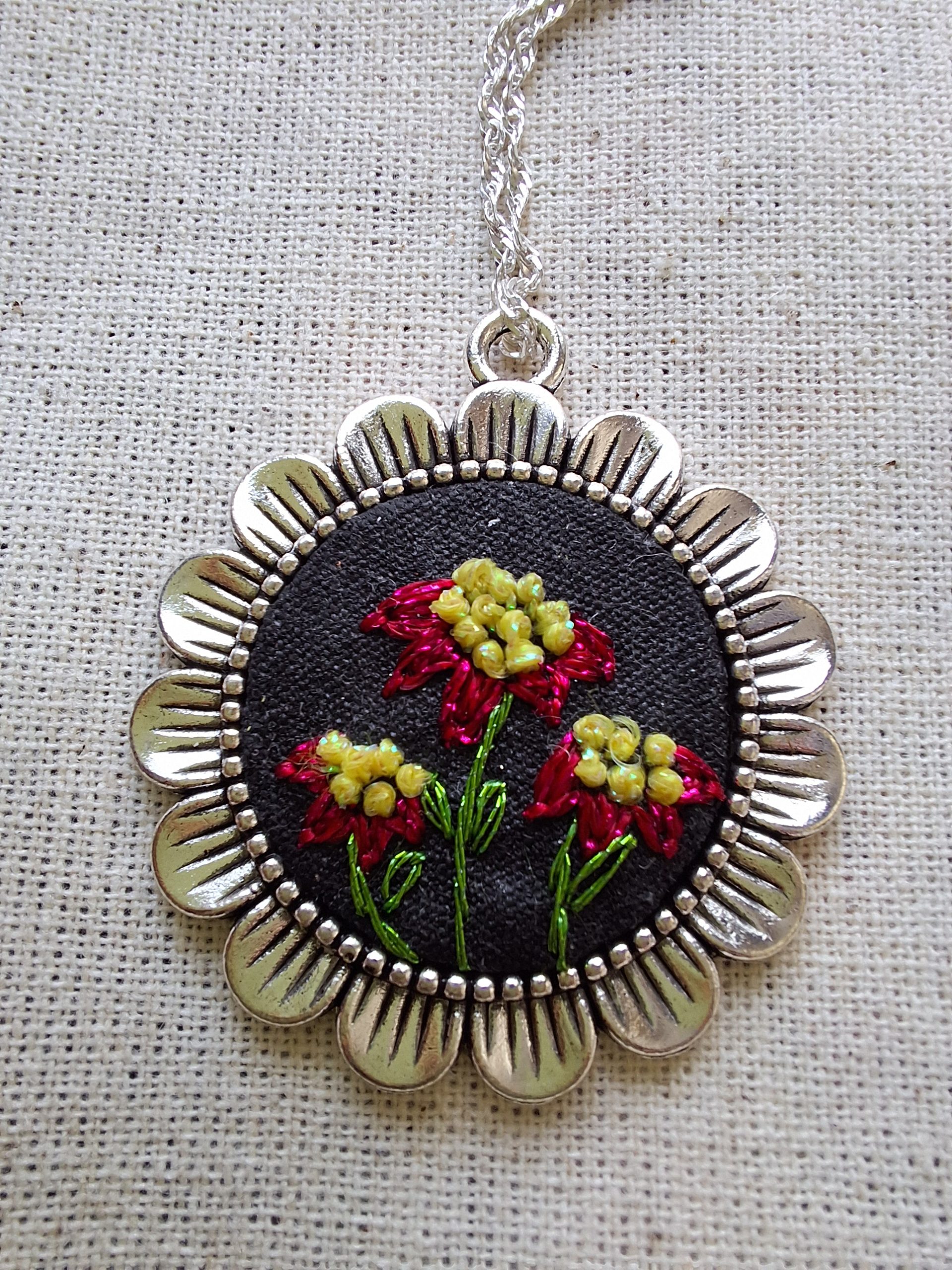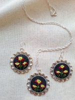• Características:  Conjunto compuesto por el colgante y aros con un delicado bordado. Bordado a mano con hilos metalizados. Incluye cadena de plata de 50 cms,  aros con ganchos de plata, instrucciones de cuidado . Todo en una hermosa caja.