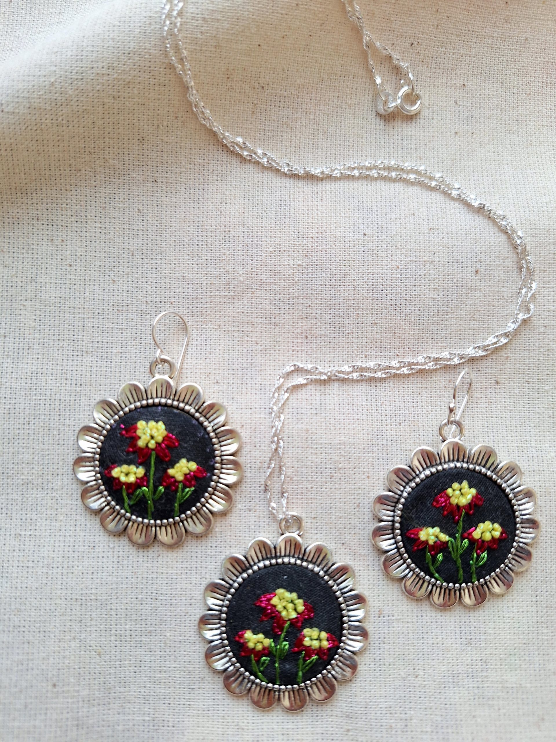 • Descripción: Conjunto de aros y colgante bordados a mano, protagonizado por tres flores rojas, donde el polen destaca gracias a la delicada técnica de nudo francés, aportando textura y relieve. Cada pieza está cuidadosamente bordada haciendo de este conjunto una joya única y especial, donde pequeños detalles pueden variar, resaltando su carácter artesanal. Un conjunto lleno de color y detalle, ideal para quienes buscan joyas hechas a mano con identidad propia.