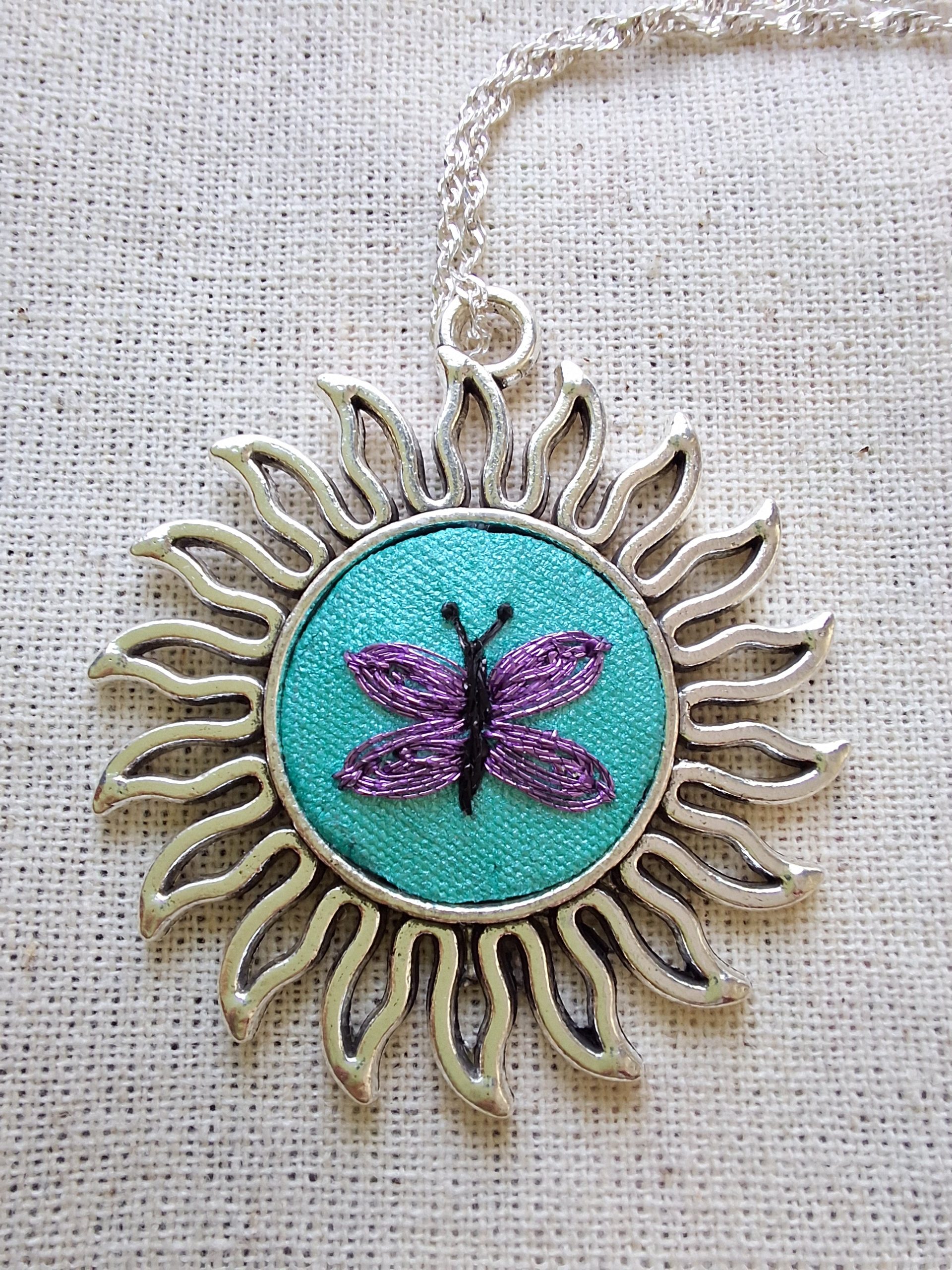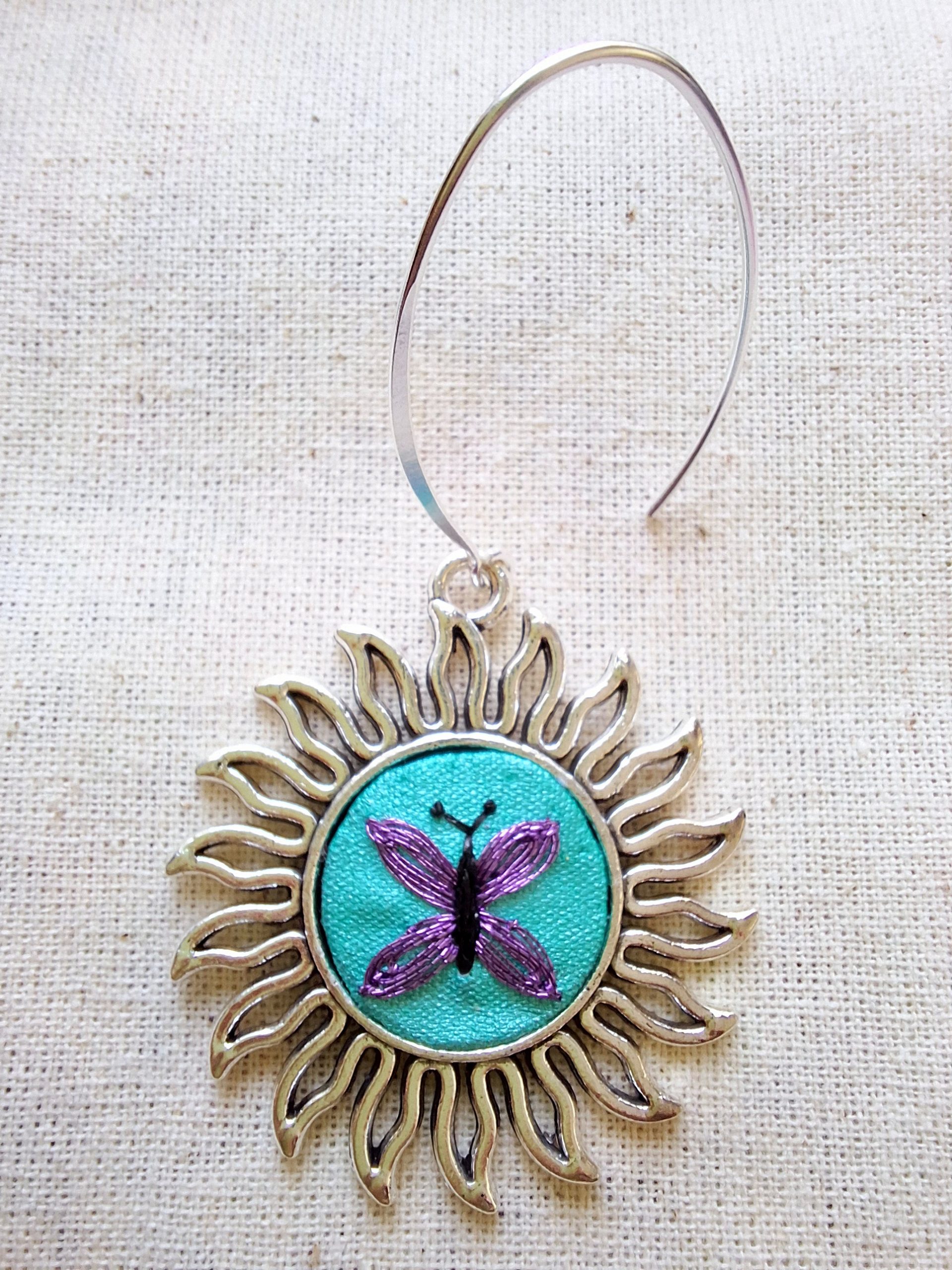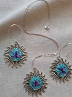 - Características: Conjunto compuesto por el colgante y aros con un delicado bordado. Bordado a mano con hilos metalizados. Incluye cadena de plata de 50 cms, aros con ganchos de plata, instrucciones de cuidado . Todo en una hermosa caja.
