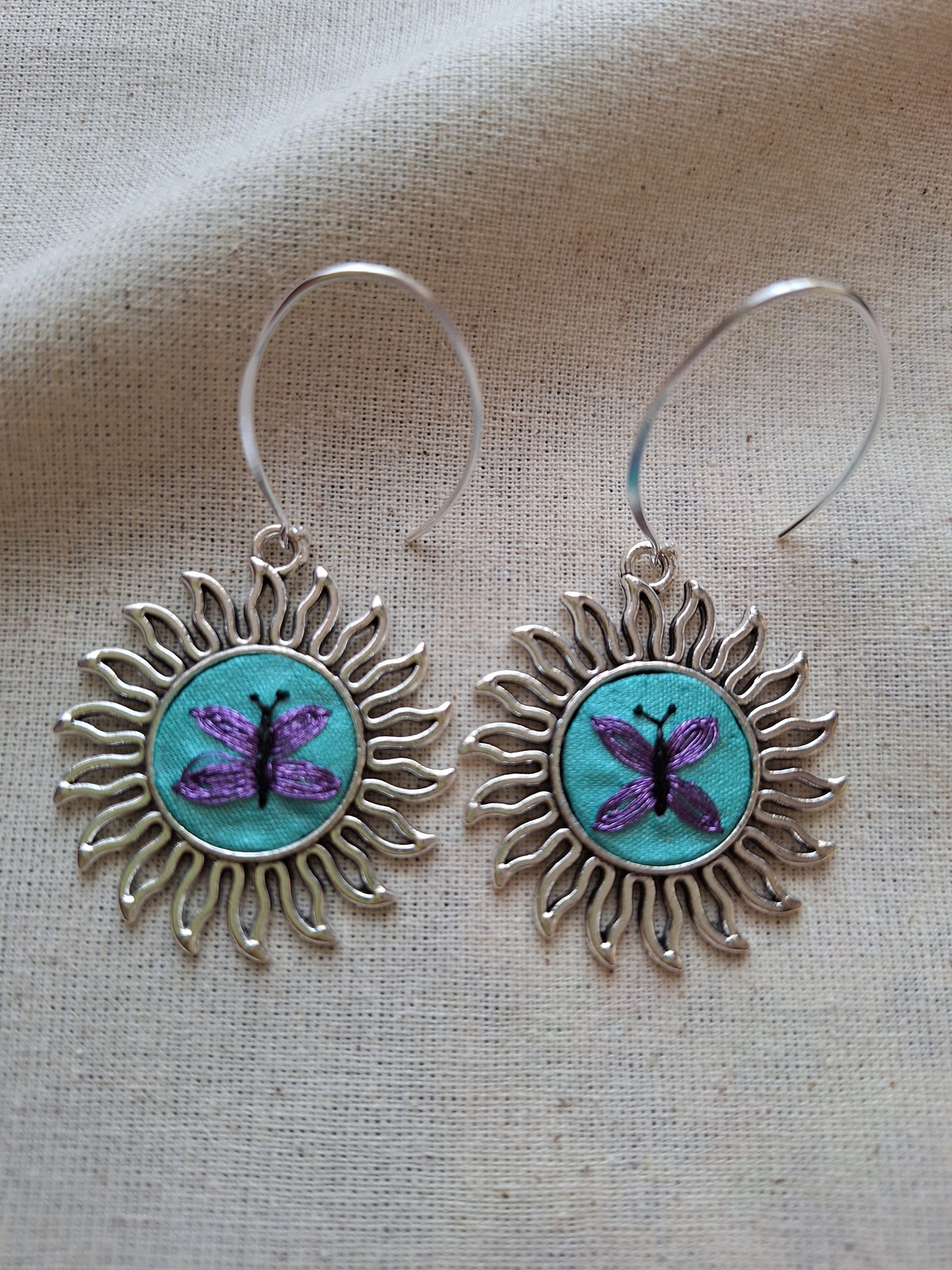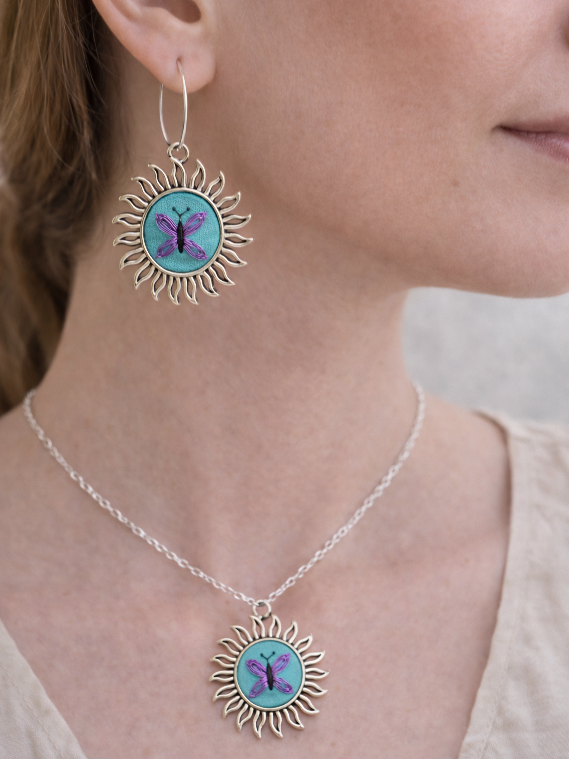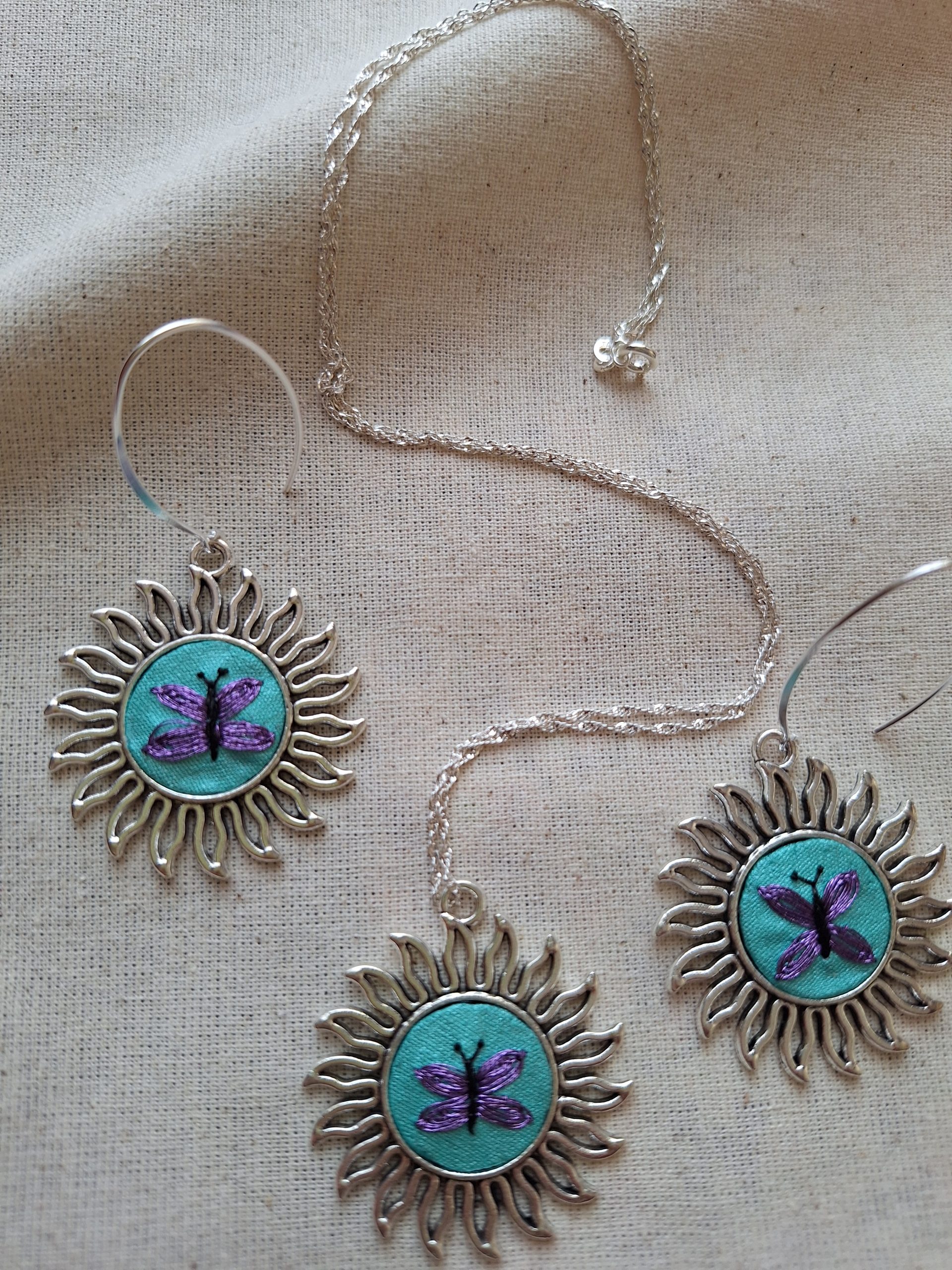 - Descripción: Conjunto de aros y colgante bordados a mano, inspirados en la delicadeza de una mariposa lila. Cada pieza está cuidadosamente bordada haciendo de este conjunto una joya única y especial, donde pequeños detalles pueden variar, resaltando su carácter artesanal. Ideal para quienes aman los accesorios hechos a mano y llenos de color y significado.
