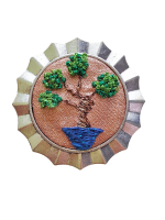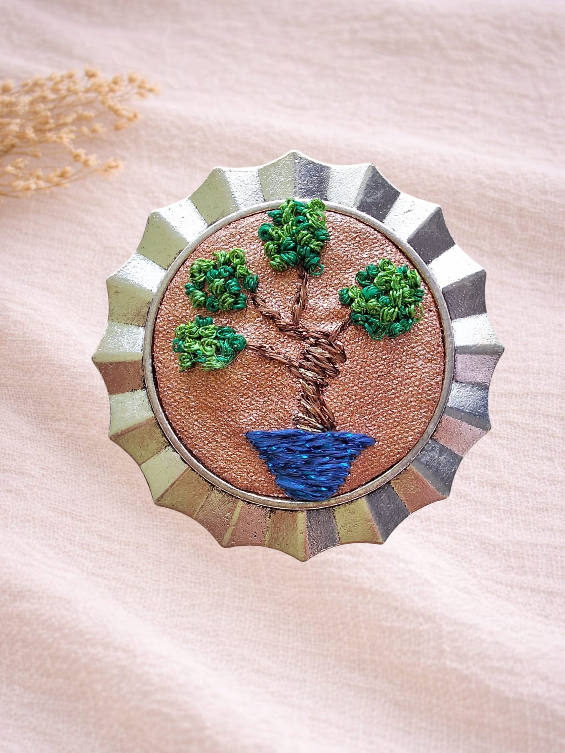 • Descripción: Prendedor/Colgante bordado a mano, inspirado en la calma y armonía de la naturaleza. Su diseño representa un delicado bonsái en una maceta azul, cuya copa está bordada con nudo francés, aportando textura y un acabado único en cada detalle.
