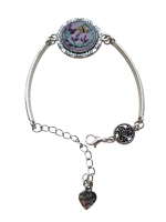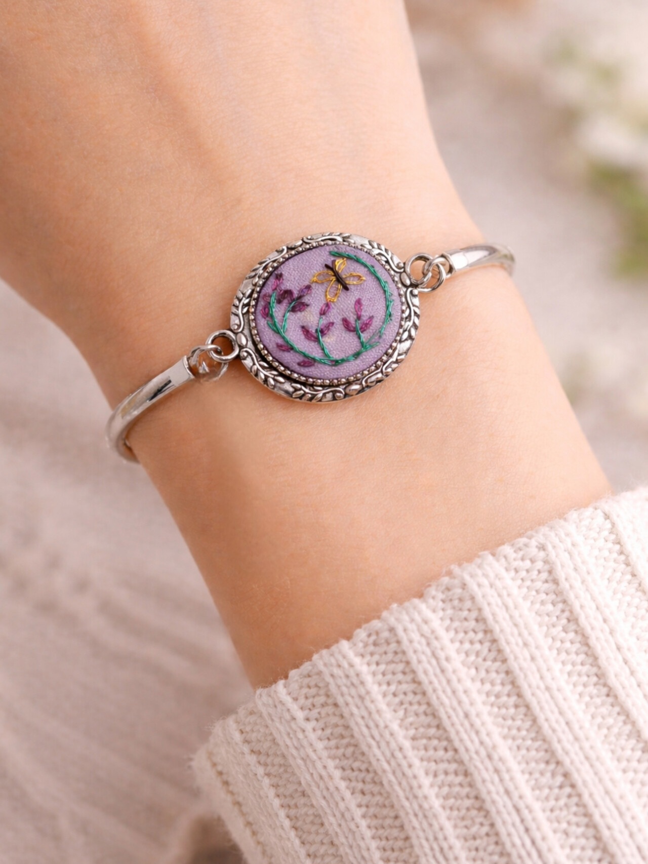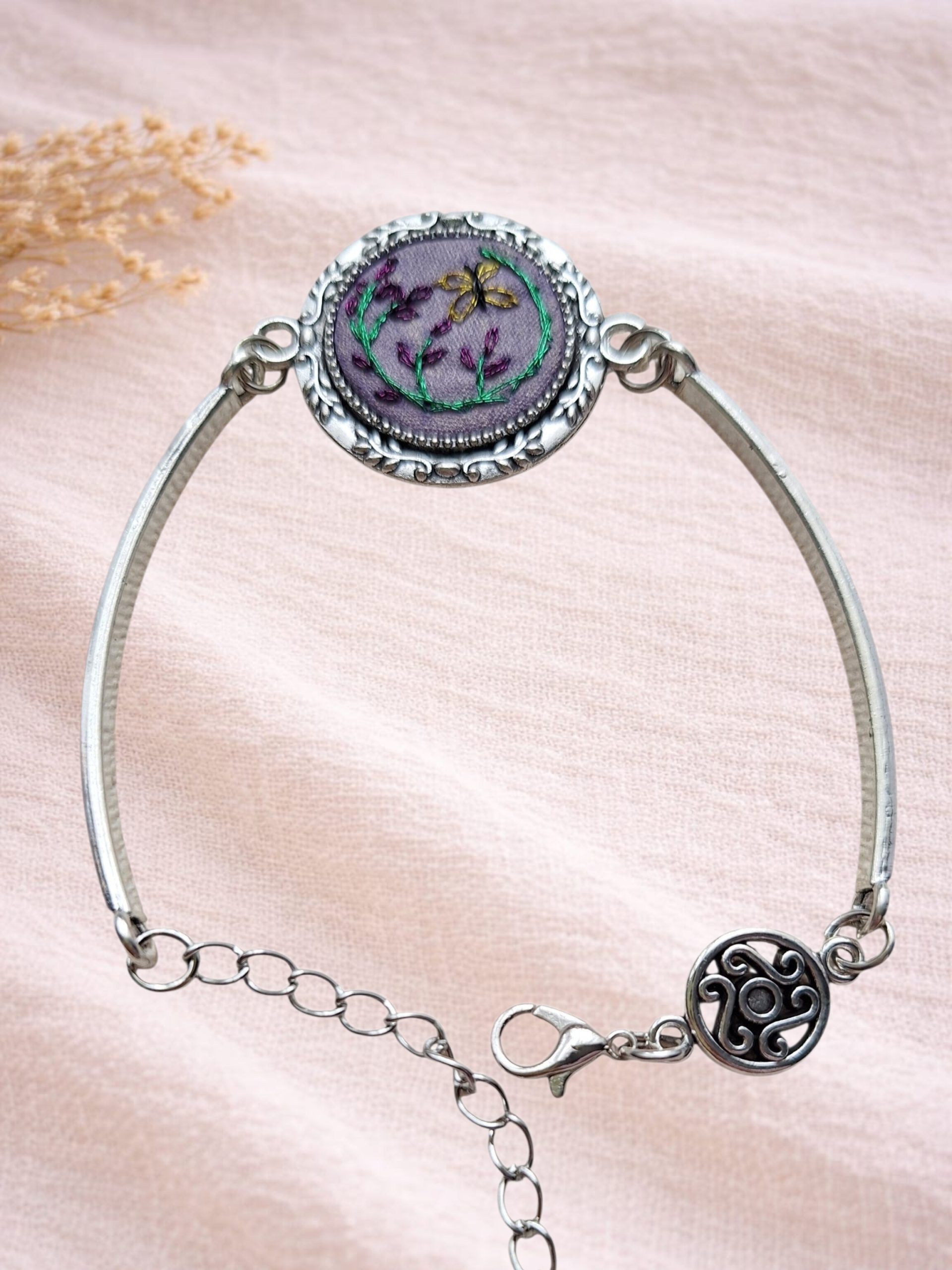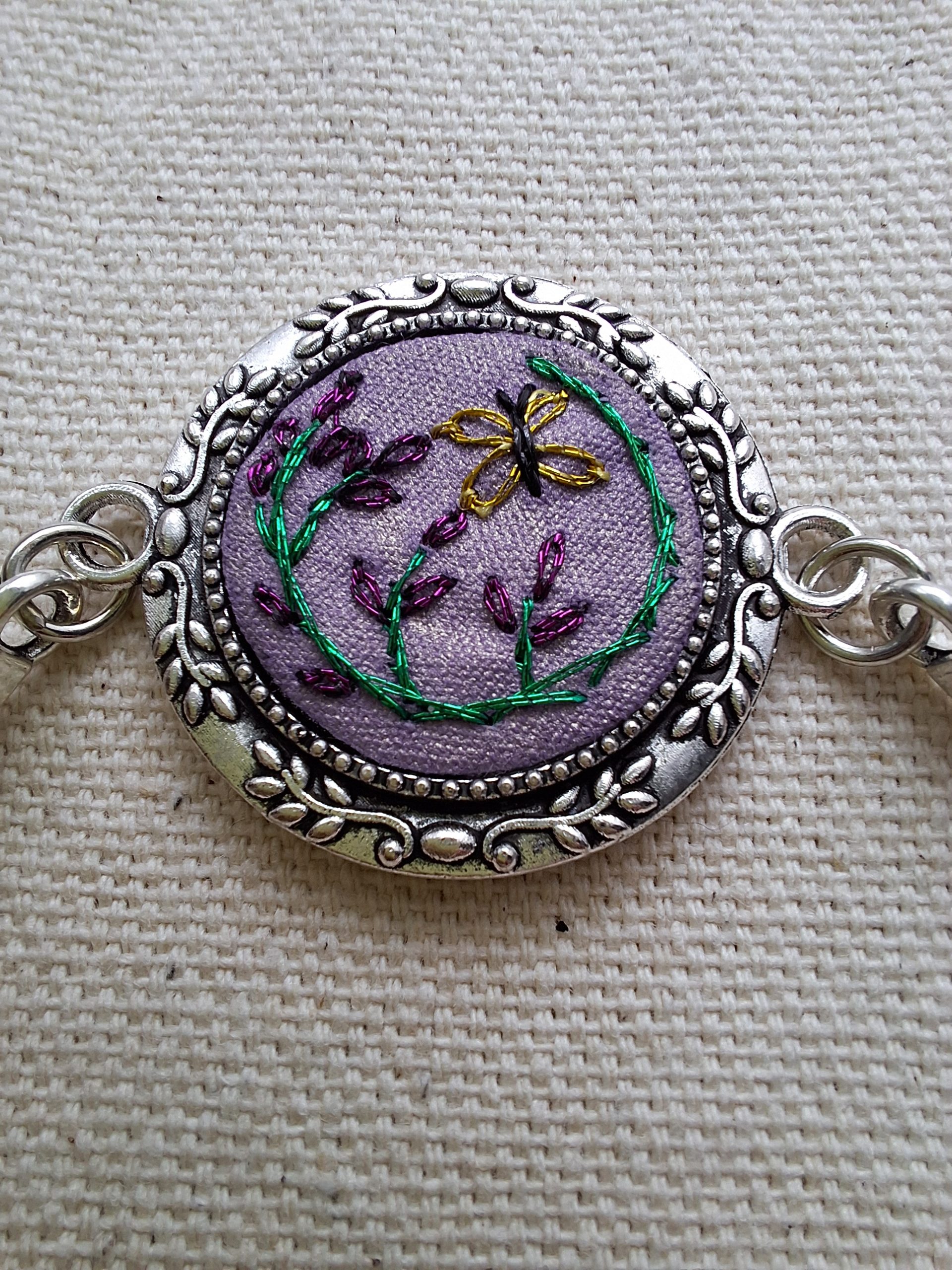 - Descripción: Pulsera bordada a mano, inspirada en la delicadeza y movimiento de la naturaleza. Su diseño presenta un semicírculo de flores moradas cuidadosamente bordadas, acompañado por una mariposa amarilla que parece revolotear suavemente entre ellas.