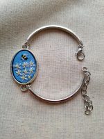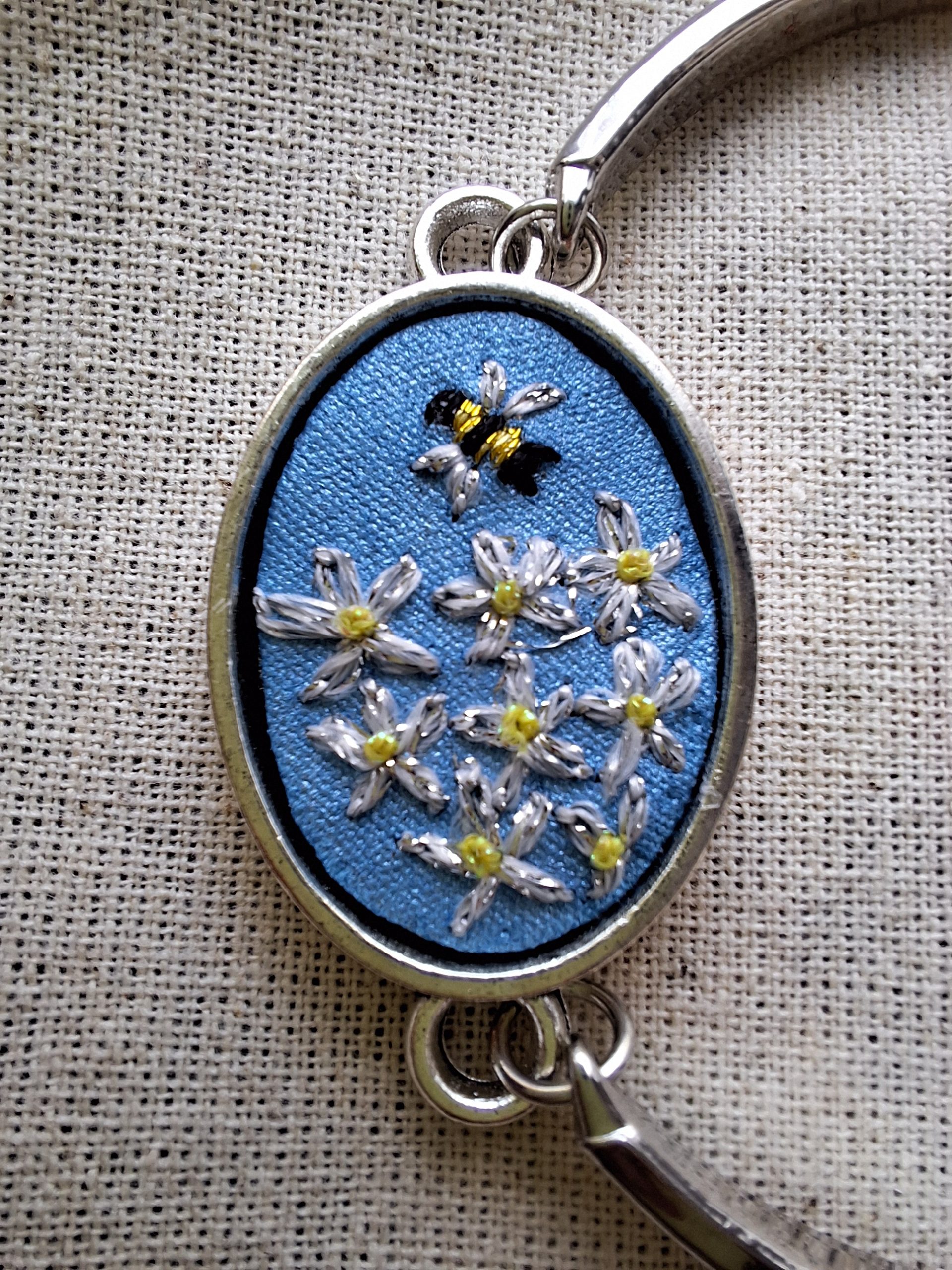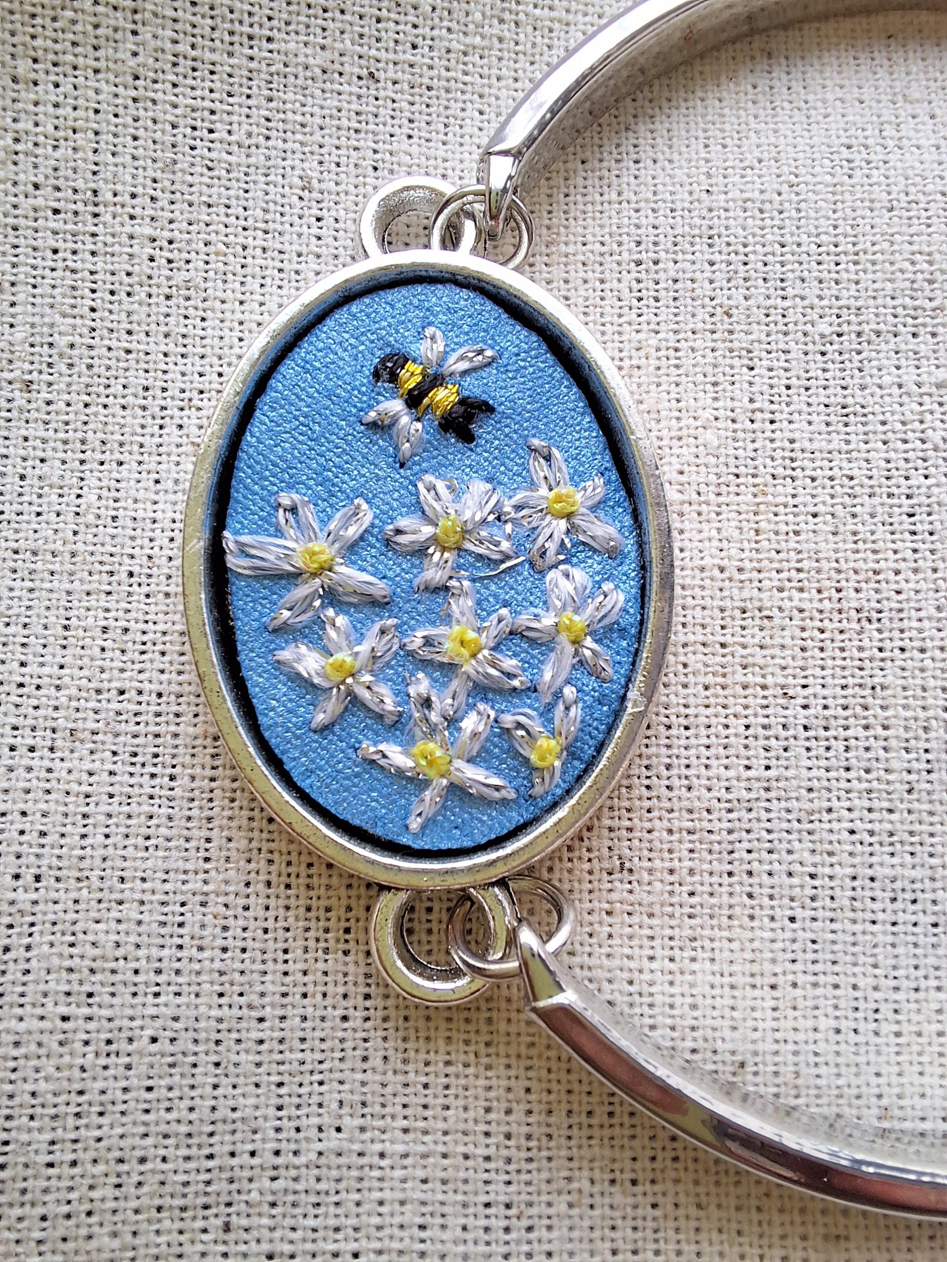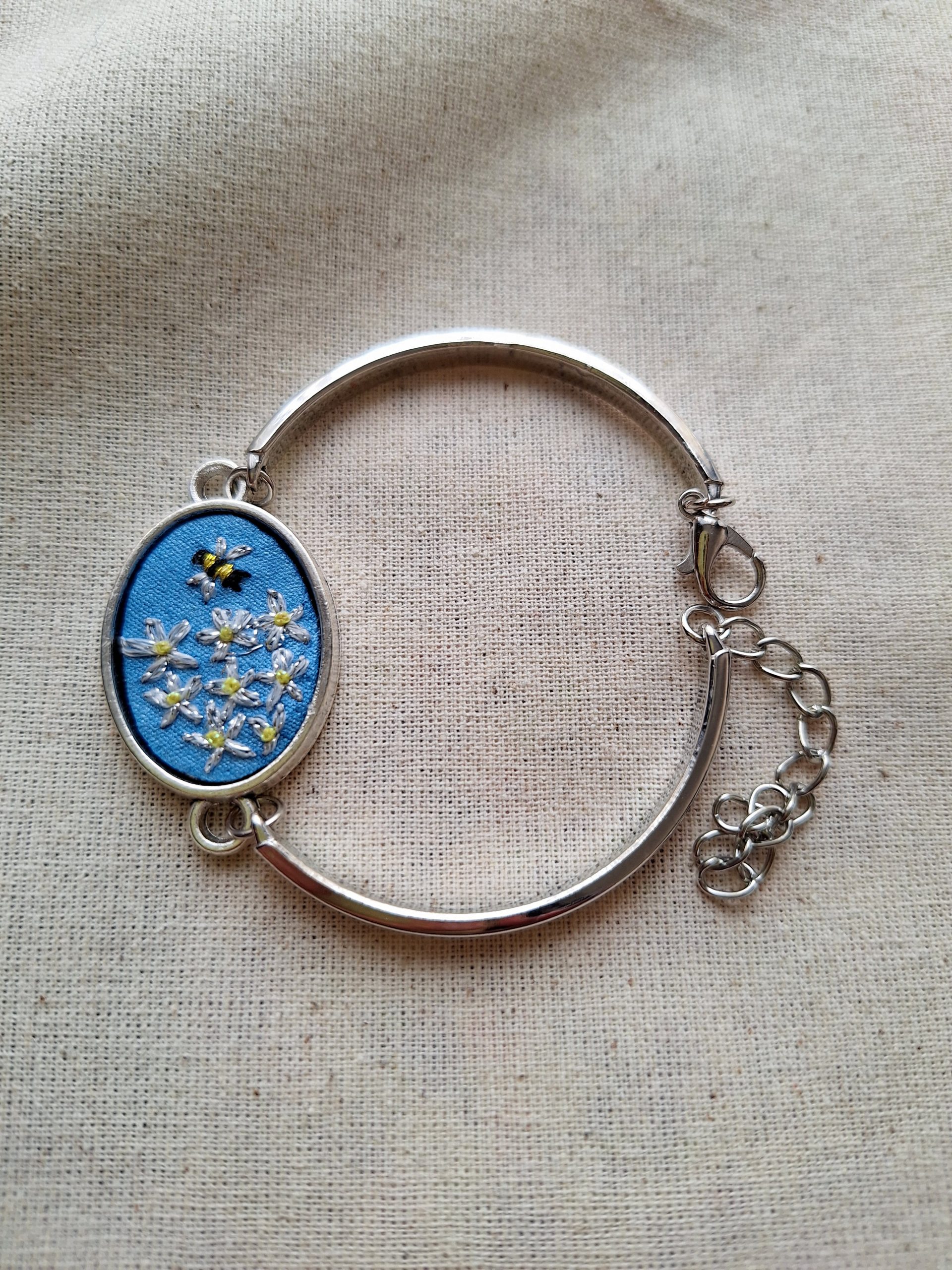 - Descripción: Pulsera bordada a mano, inspirada en la vida del jardín: una abejita acercándose a un grupo de margaritas. Una escena llena de movimiento y dulzura, que simboliza la conexión con la naturaleza y el valor de los pequeños detalles. Cada pulsera es única, con sutiles variaciones propias del trabajo artesanal, convirtiéndola en una joya especial y llena de encanto. Bordada con hilos metalizados.