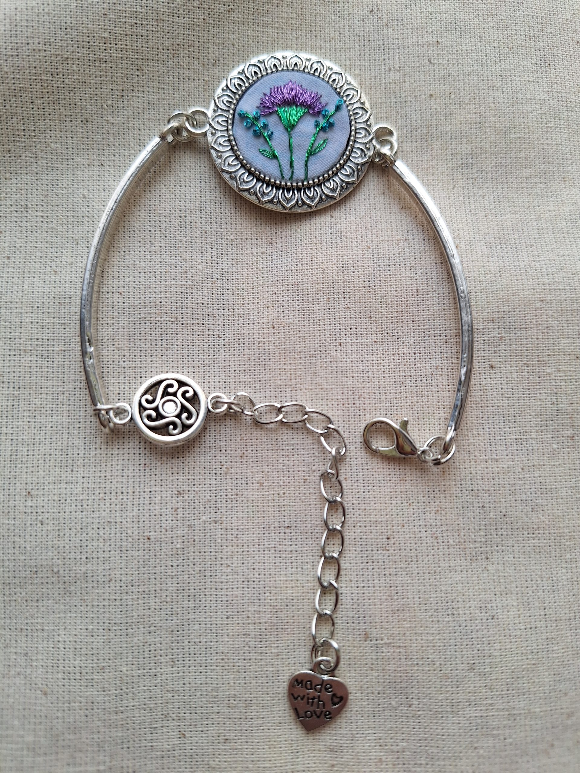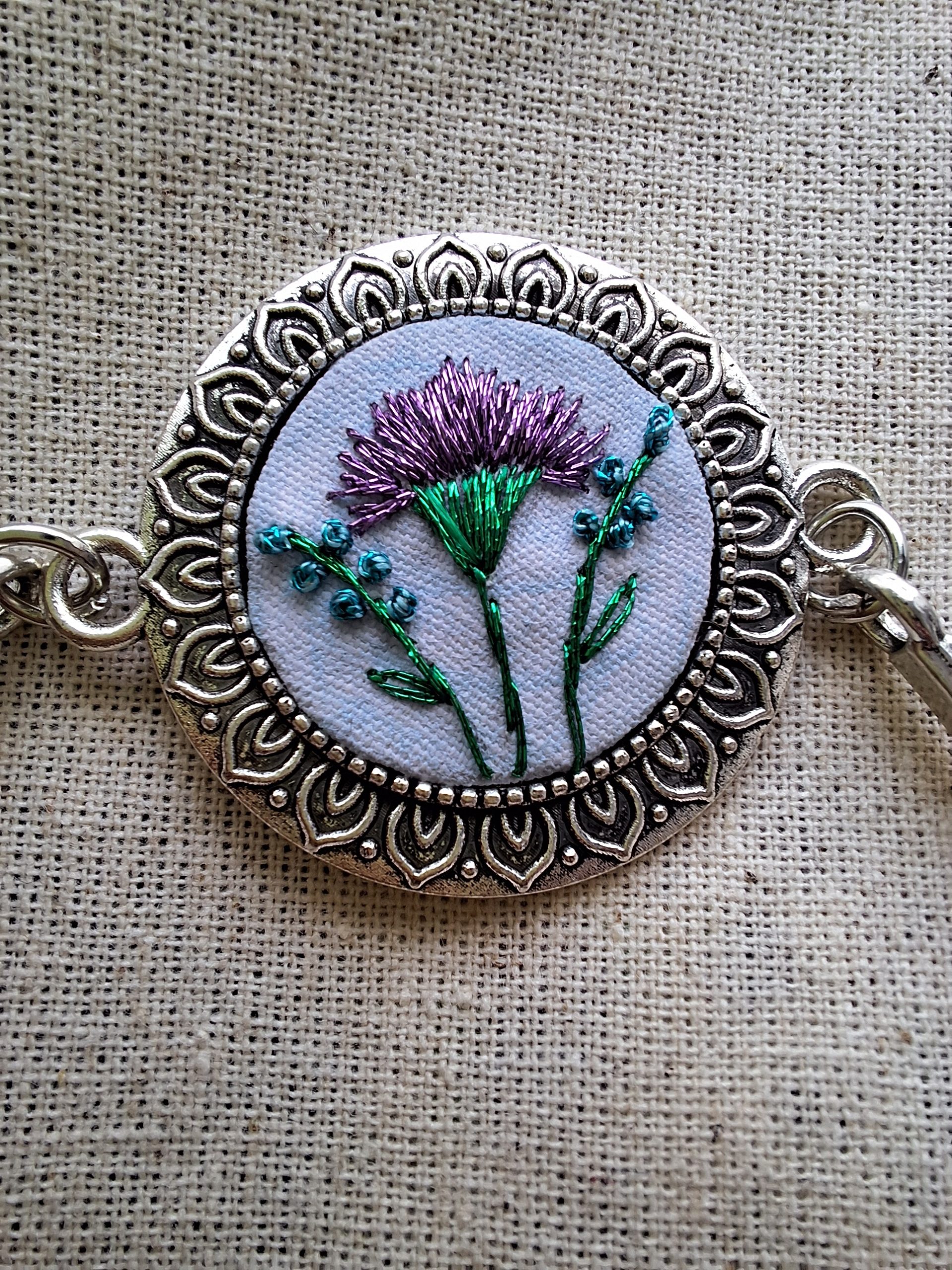 - Descripción: Pulsera bordada a mano, con un clavel lila como protagonista en el centro y delicadas varas florales en tonos turquesa en sus extremos. Una pieza equilibrada y armónica, inspirada en la naturaleza y el color. Cada pulsera es única, con sutiles variaciones propias del trabajo artesanal, convirtiéndola en una joya especial y llena de carácter. Bordada con hilos metalizados.