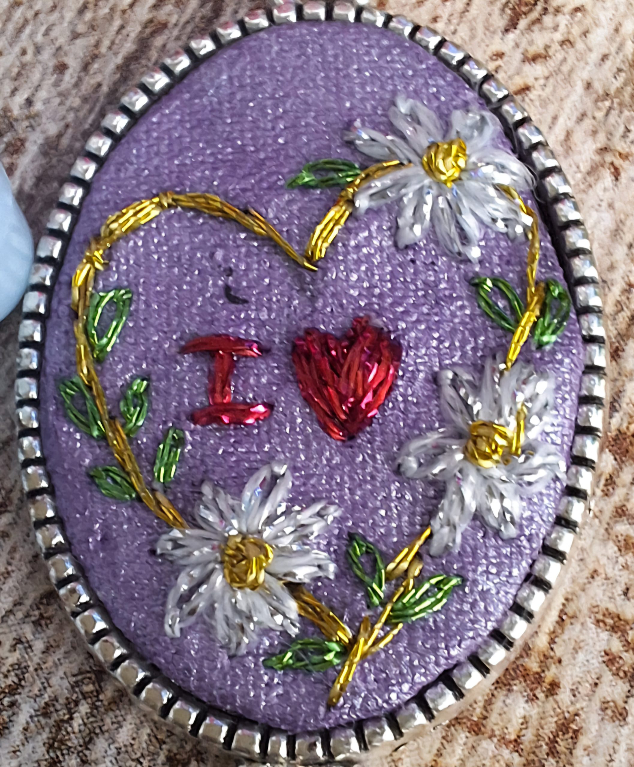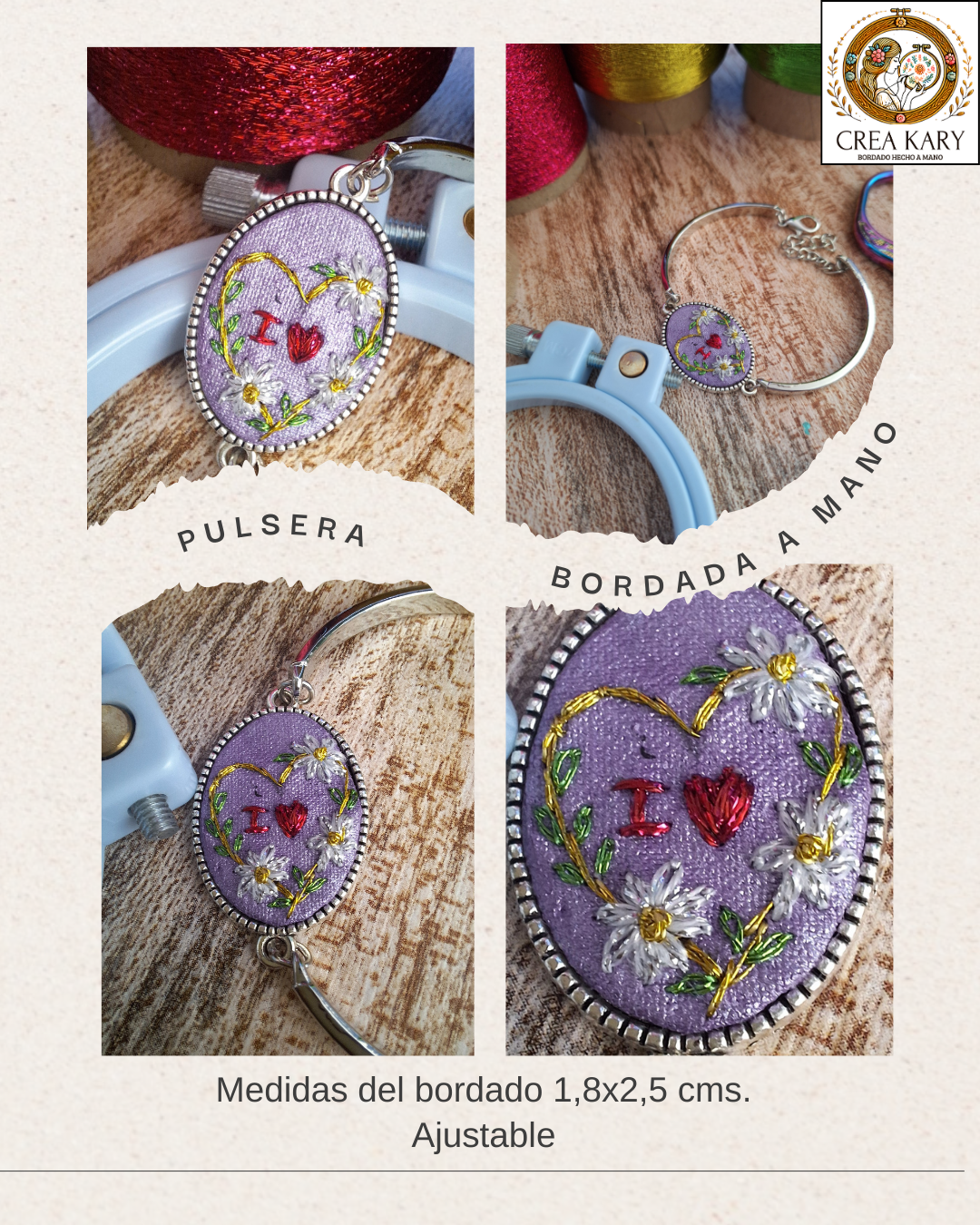 - Descripción: Pulsera con un hermoso bordado de amor. Un corazón amarillo adornado con flores blancas y en el centro del corazón se lee I Love. Bordada a mano con hilos metalizados.