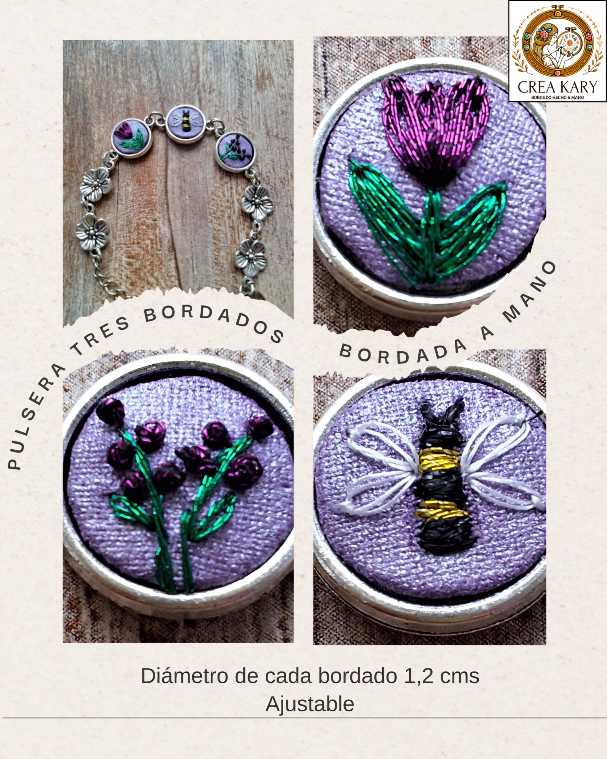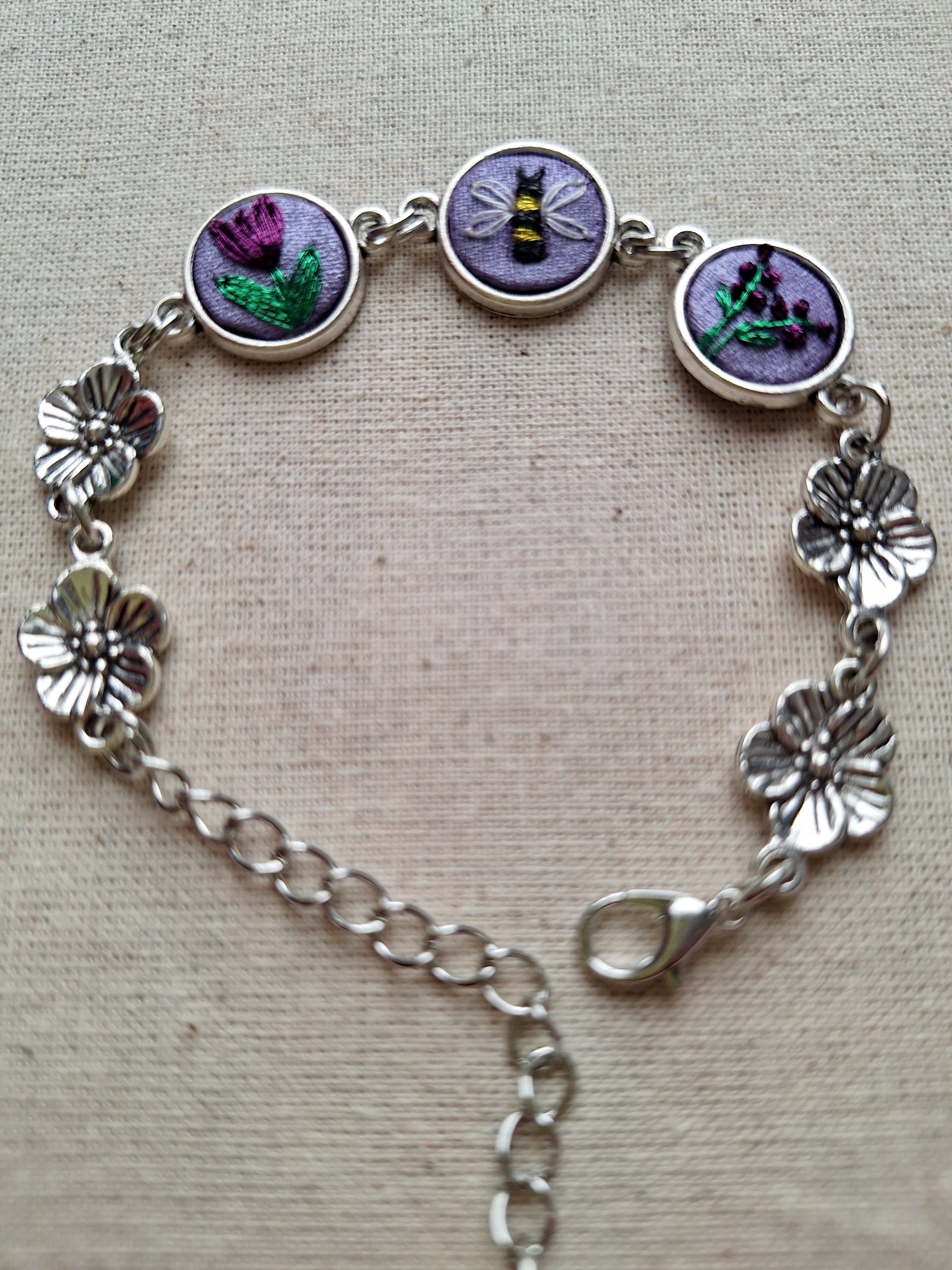 • Descripción:  Pulsera  compuesta por 3 bordados: tulipán morado, una abeja y lavandas.  Bordada a mano con hilos metalizados.