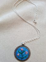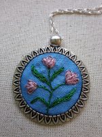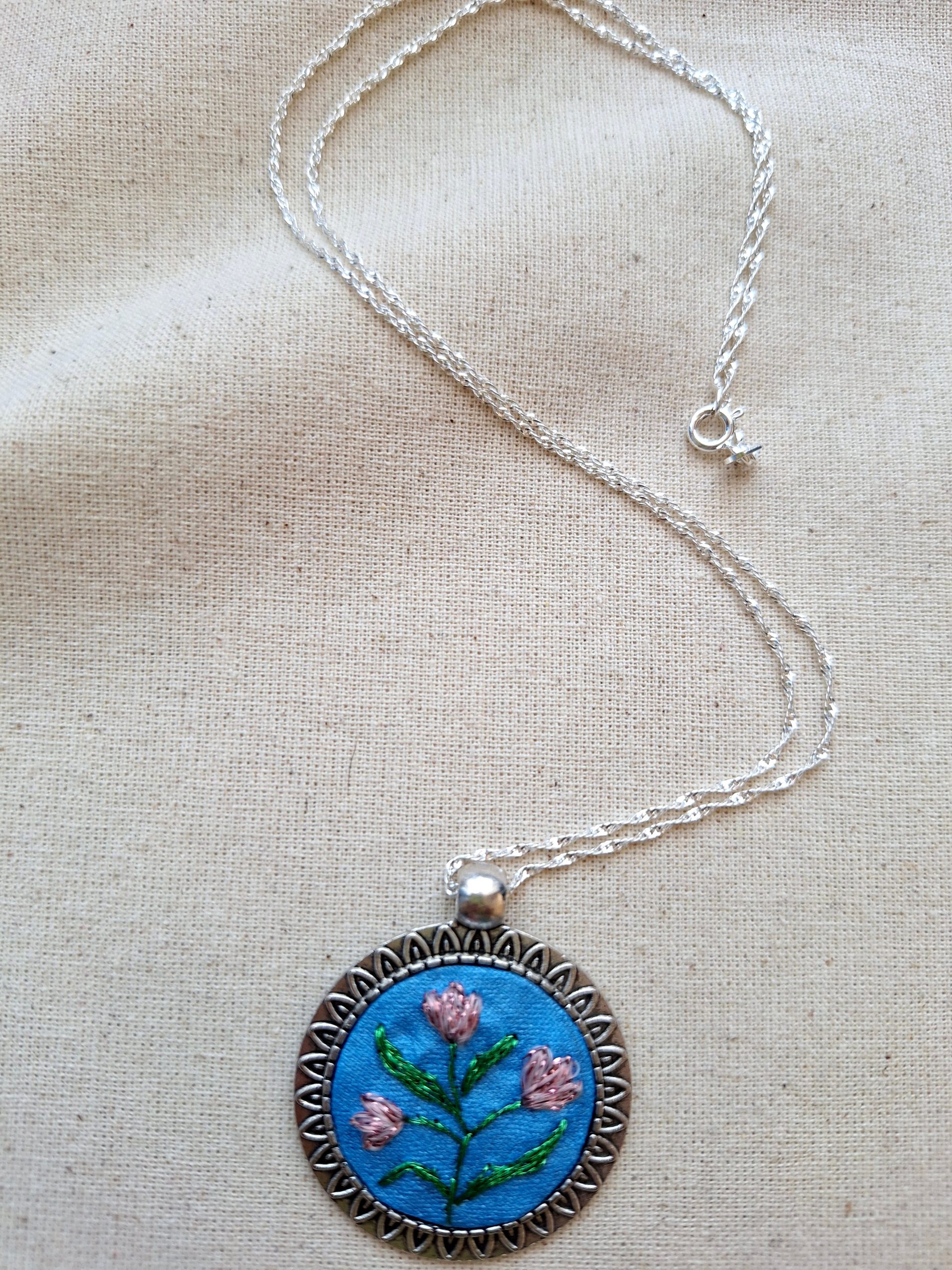 - Descripción: Colgante bordado a mano con un diseño de tulipanes, realizado puntada a puntada con especial cuidado en el color y el detalle. Una pieza floral delicada y única, inspirada en la armonía y la belleza de la naturaleza. Bordado con hilos metalizados.