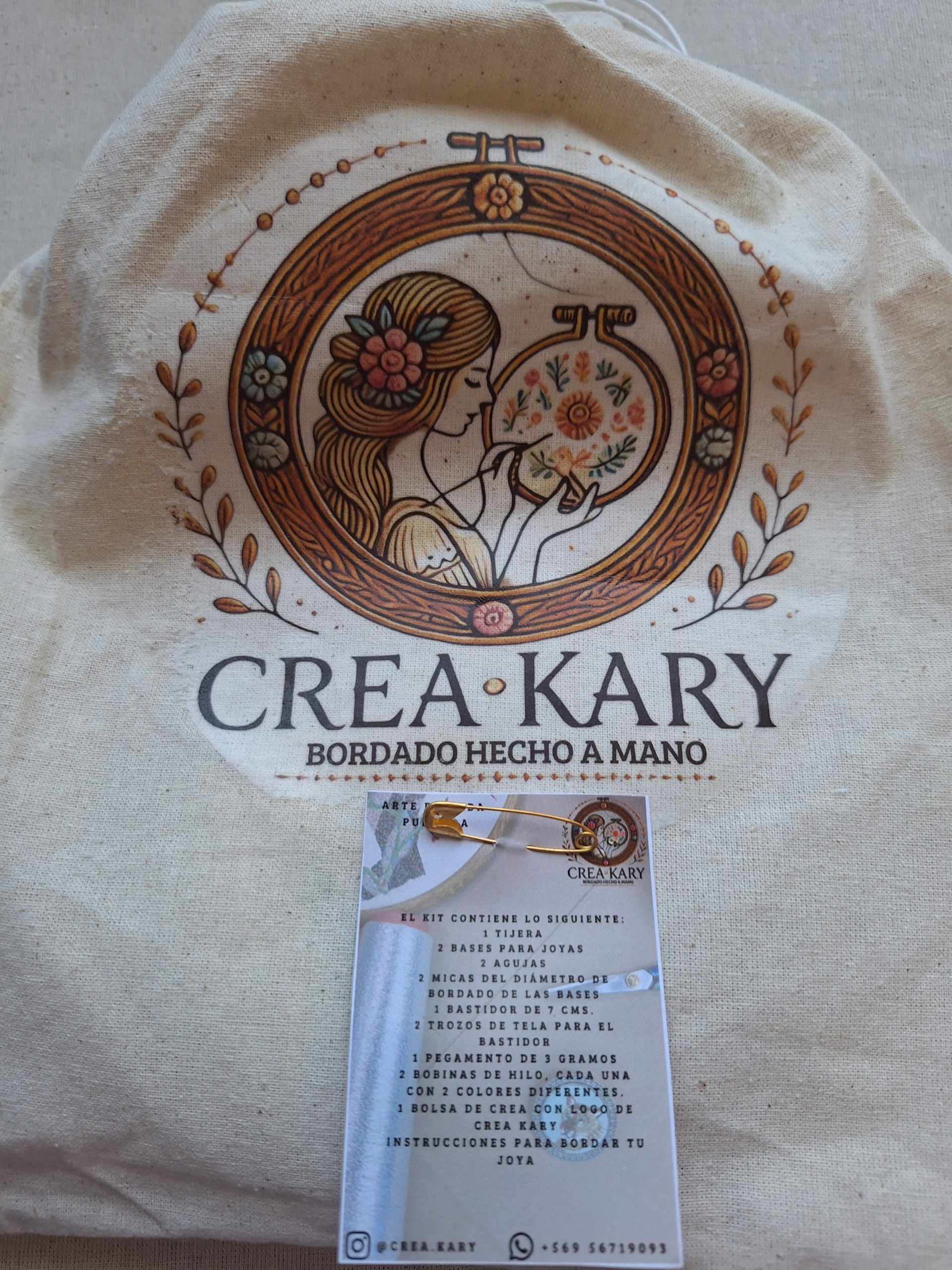 Con este kit puedes aprender a crear tus propias joyas. Incluye: 2 bases para joyas, 1 tijera, 2 agujas, 2 trozos de tela, pegamento, hilos, instrucciones para bordar y todo lo que necesitas para crear 2 joyas. Todo en una linda bolsa de Crea Kary.